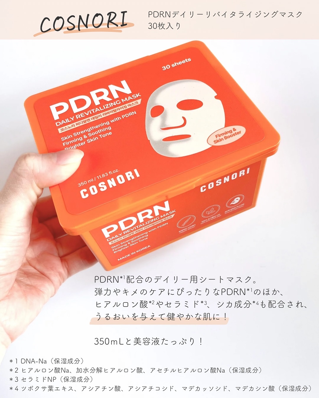PDRNショット675とPDRNデイリーマスクのW使いがめっちゃよかった…! サーモンPDRN(5,000ppm)やパンテノール(50,000ppm)配合で肌にうるおいを与えて健やかな状態を目指すスキンケア美容液♡ 100%植物性ヴィーガンシートが肌に優しくフィットして毎日使いやすいのが嬉しいポイント◎