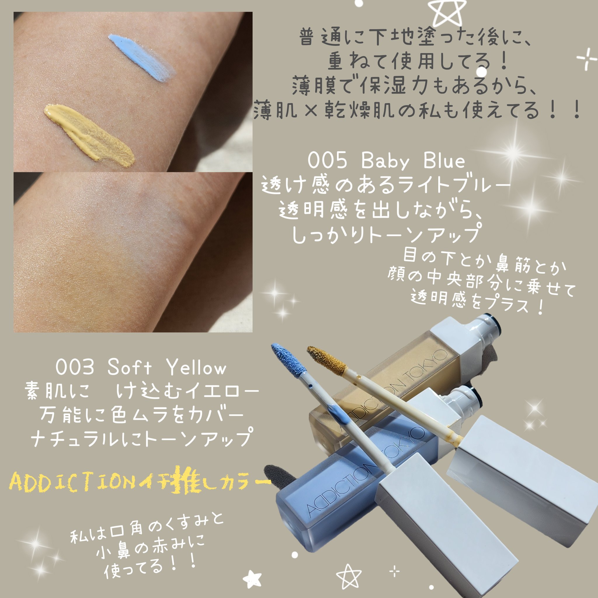 アディクションさまからいただきました🎁スキンリフレクトカラーコレクター✨今回は003SoftYellowと005BabyBlueをお試しさせていただきました。薄く透けるようなカラーフィルターで肌悩みを補正してくれる。すっと伸びて肌にぴたっと密...