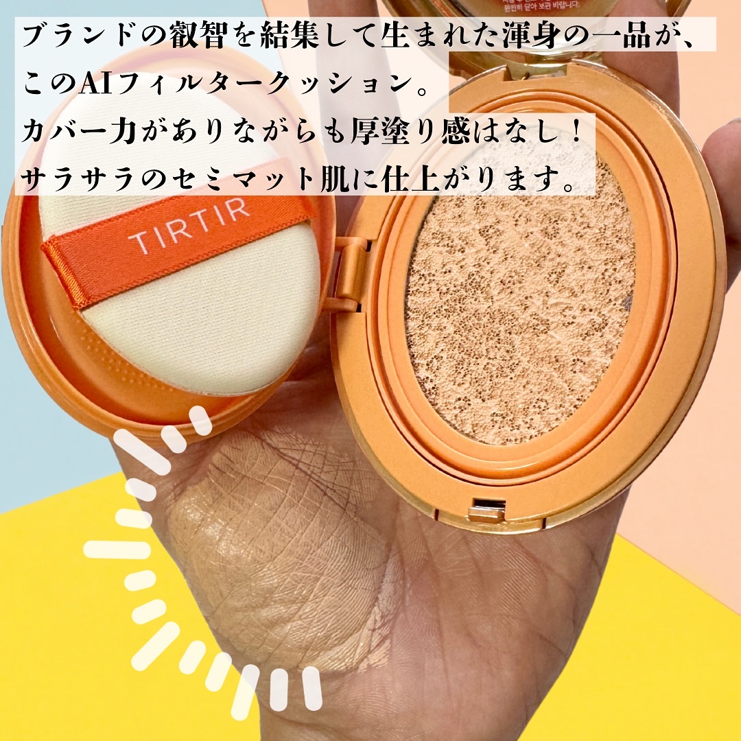 AIフィルターがかかった肌のような、ふんわりセミマットに仕上がるクッションファンデ🧡 ベストセラー商品のMASK FIT RED CUSHIONのカバー力はそのまま軽いテクスチャーでしっとり仕上がるよ🍊 TIRTIR MASK FIT AI FILTER CUSHION