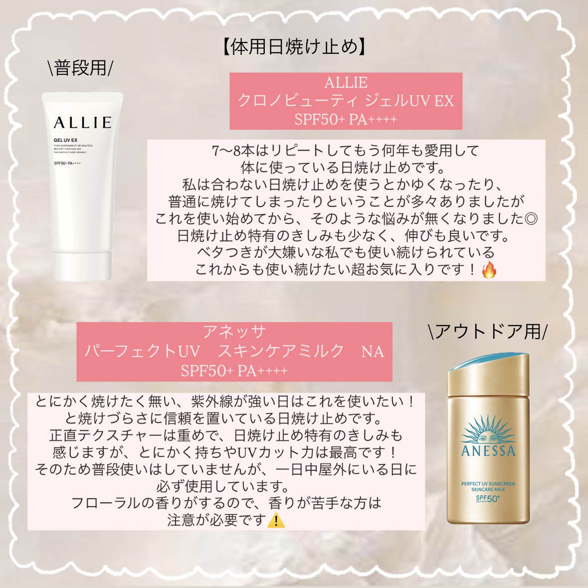まじで焼けないと大人気のアネッサ 日焼け止めなのに、生き物のようにヨレや隙間を自動修復する機能があり本当に高機能でおもしろいです UVカットパウダーはレフィルも発売されるしブラシは取り外して洗うことができるので清潔に長く使用できそうです! 特にミルクは化粧も邪魔せずテカテカしにくいので好きです