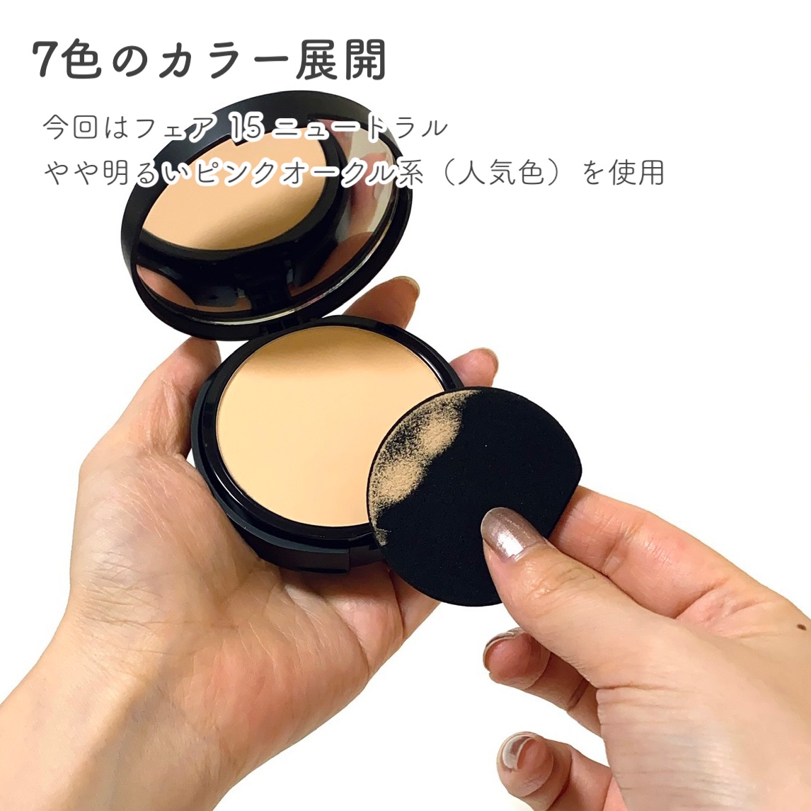 - 24時間*つけたての美しさを。毛穴・色ムラを美肌カバー。 しっとりした質感のパウダーが、肌に負担感なくすべるように広がり、均一にフィット。 色ムラやくすみ、さらに毛穴やキメなどの凹凸までも自然にハイカバー。 光拡散効果により、毛穴の凹凸をぼかして隠します。 透明感があるのに肌のアラは感じさせない、なめらかなセミマットな仕上がり。 重ねづけしても厚塗り感がなく、ライト~フルカバレッジと調整も自由自在。 スポンジのウェット使いで、ソフトなツヤ質感も楽しめます。 皮脂やテカリを抑え、様々な環境でも、さらりとした美肌印象を目指します。 水、汗、湿度、色移りプルーフ。 * 使用タイミングのこと