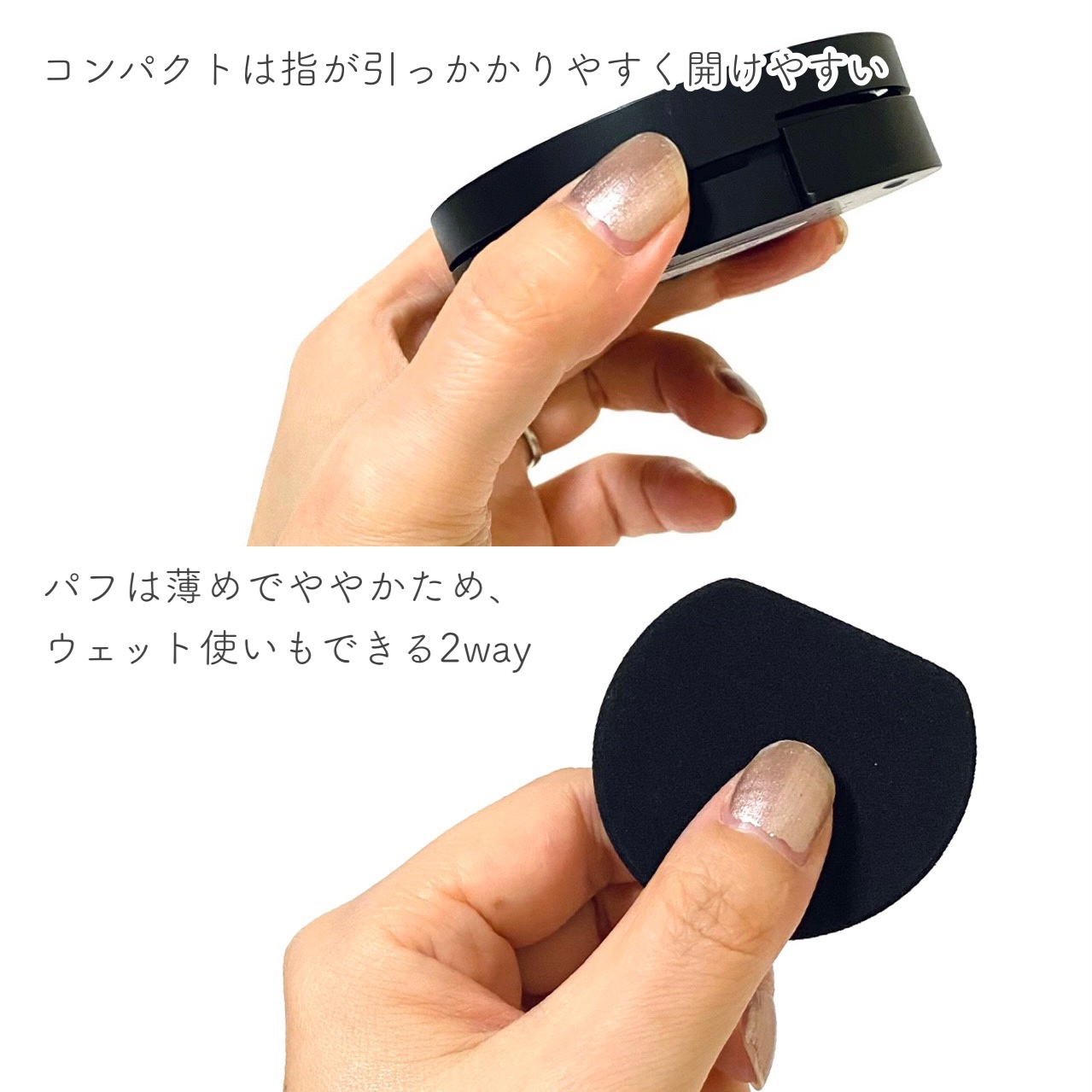 しっとりとした質感のパウダーが均一にフィット♪ すべるように広がって、軽やかなつけ心地◎ なめらかなセミマット仕上がりが素敵♪ 特にカバーしたい部分には、ポンポンとおくように重ねづけ◎ スポンジのウェット使いで、密着感とソフトなツヤのある仕上がりも楽しめる♪