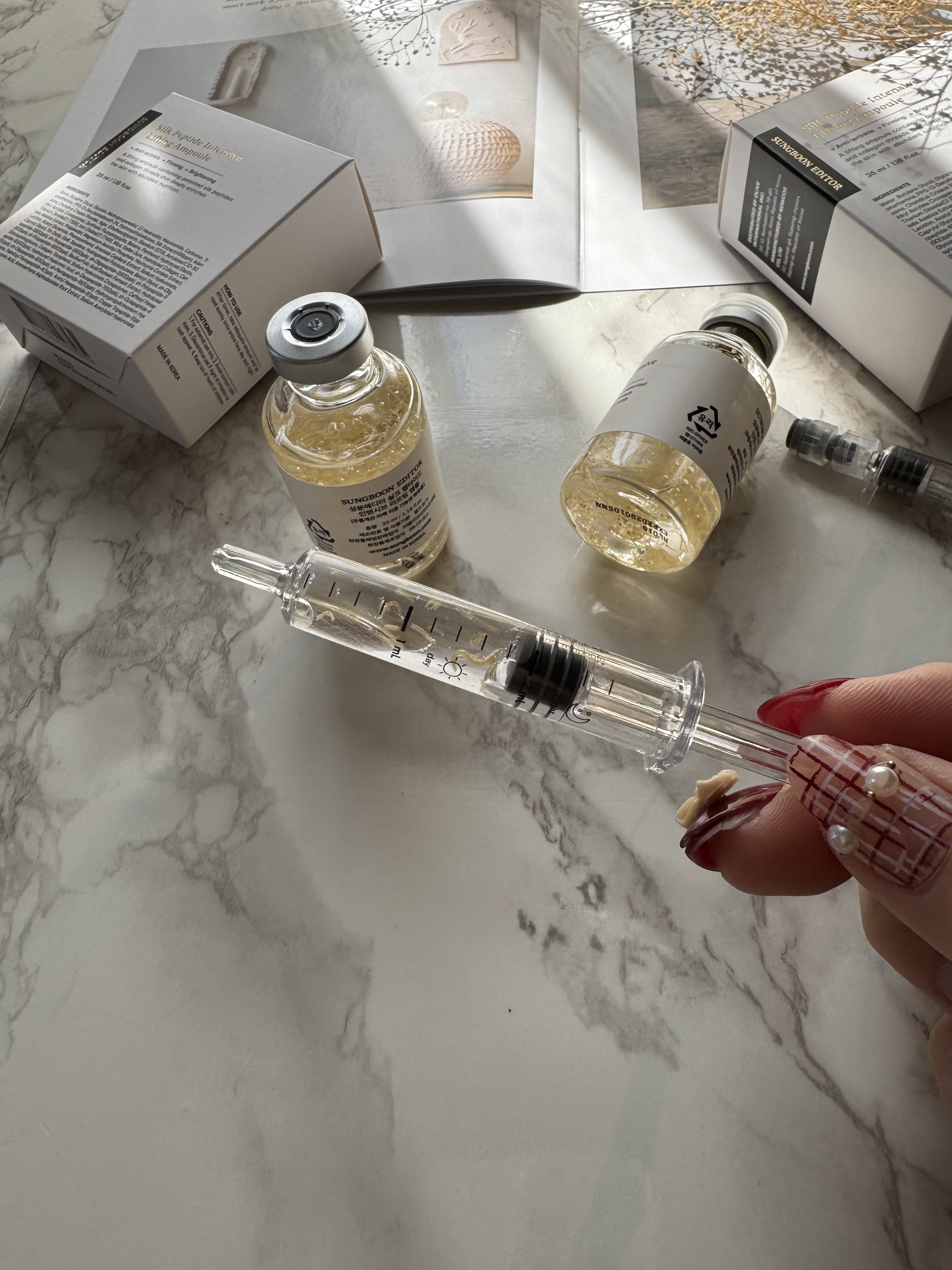 まるで塗る糸リフト?! 「成分エディター シルクペプチドインテンシブリフティングアンプル」 高濃度シルク成分+ペプチド13種に金色のコラーゲン糸を配合 優しく肌になじませるとスっと馴染んでベタつきにくいのが嬉しいテクスチャー。