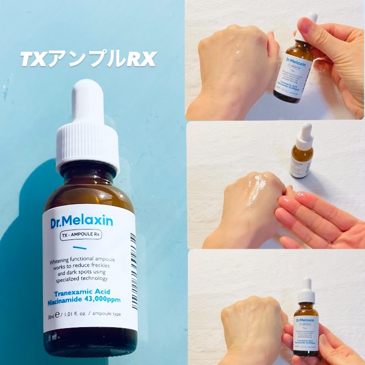トラネキサム酸とナイアシンアミドを配合したTXシリーズ✨ ドクターメラクチンだけのリポソーム化したナノトラネキサム酸で、より角質層まで浸透しやすくなっているそうです! メラニンの生成を抑え、シミ・そばかすを防ぎ、肌トーンを均一に整えてくれるよ😊 TXアンプルRx ややとろみのあるテクスチャー。みずみずしさがありスーッと肌に馴染んでくれます。