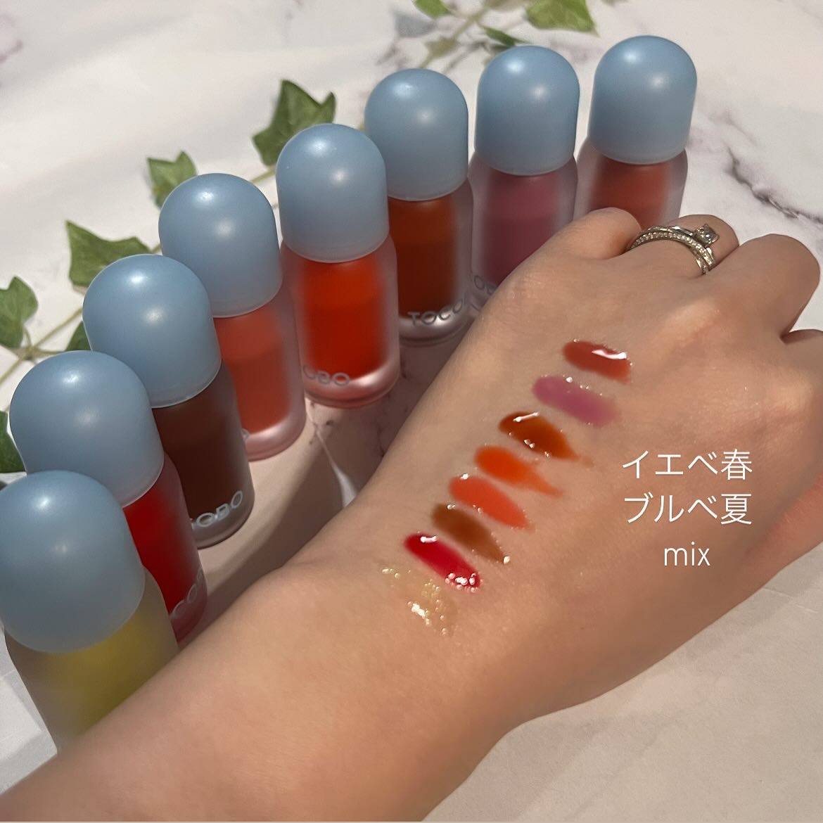 唇の角質ケア、唇のしわをカバーしてくれるボリューム感リップオイル。11番は、プランプ効果が高く塗った直後からピリピリをしっかり感じられます マットリップや、ティントをベースに塗り、その上からトコボ リップオイルを塗ると魅力的なタンフル(粘膜)リップに ツヤツヤな仕上がりで可愛い🩵11番以外はプランプ効果はあるもののそんなに強くピリピリしないので普段使いしやすいかなと思います