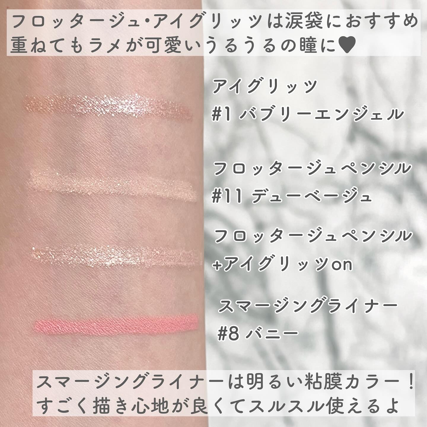 イエベセット使用・フロッタージュペンシル#1・スマージングアンダーライナー#7・アイグリッツ#2・シェーディング#1🩷イエベセット、ブルベセットで自分のパーソナルカラーに合ったコスメを選べる🩷特にフロッタージュペンシルとアイグリッツは相性抜群...