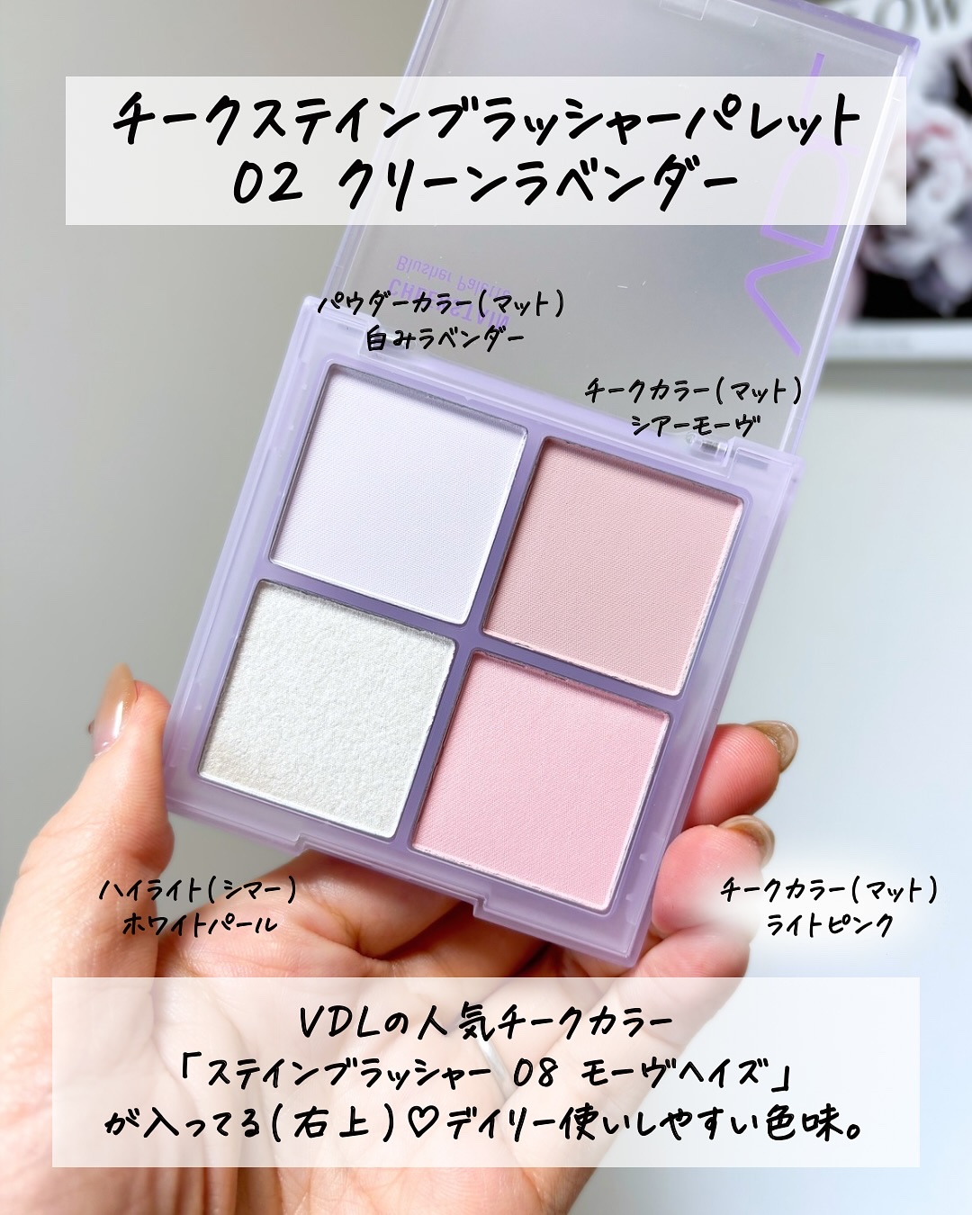 - VDL チークステイン ブラッシャーの人気カラー01 バウンシング ピーチと08 モーブ ヘイズに合わせたパウダーカラー、チークカラー、ハイライターカラーが揃っているパレット! 発色は뽀용(ぽよん)チーク*のまま! 各パーソナルカラーに合わせて作られたチークパレットなので自分に似合うパレットを選びやすいです! *뽀용(ぽよん)とは韓国語で白みたっぷりのパステルカラーを表現した言葉です。