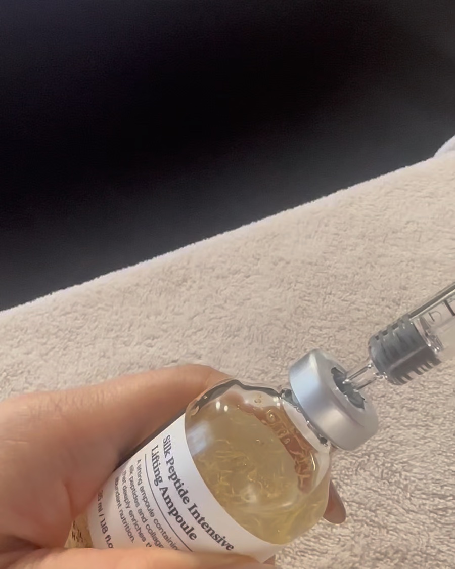 注射器で吸い上げて使うアンプル! 乾燥による小じわや弾力ケアをしてくれる韓国のTVでも紹介された実力派アンプル♡ 特許を取得したシルクペプチド成分がコラーゲン柱を作り弾力ハリケア♡ 塗布後はもっちりとした肌に💓 注射器型で部分的に塗布しやすく形が面白いのでついたくさん吸い上げたくなりますが少量でよく伸びるのでコスパもいい◎