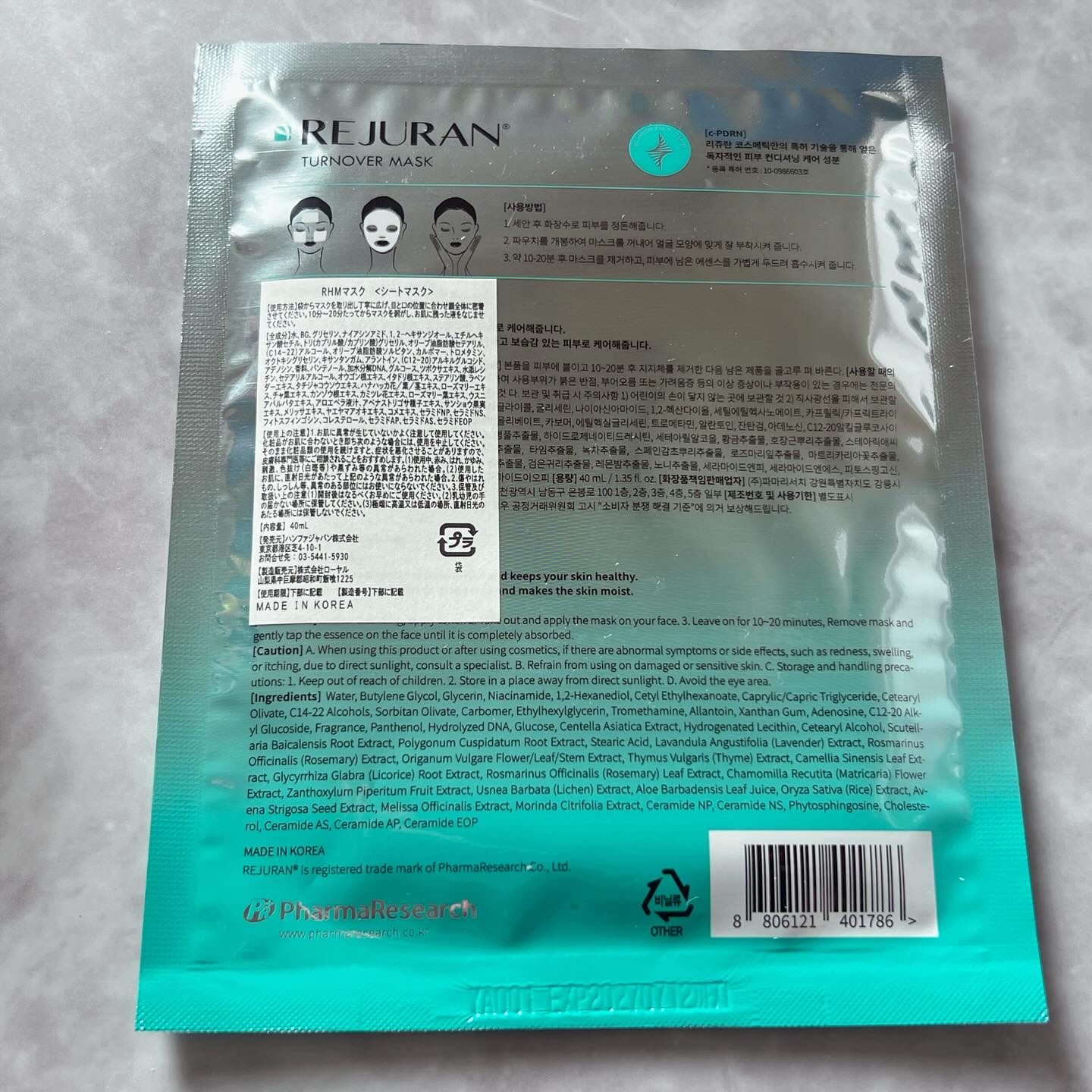 - リジュランで愛され続けるマスクパックシリーズの1つ「ターンオーバーマスク」 独自開発成分 c-PDRN※1 をはじめ、アデノシン※2、センテラエキス※3 などの美容成分をたっぷり配合。マスク1枚に美容液約1本分(40mL)を凝縮し、うるおいをたっぷりチャージ。肌にぴたっと密着し、乾燥やゆらぎ※4を感じやすい肌をやさしく包み込みます。 乾燥、つっぱり感が気になる肌、外部の刺激でストレスを受けた肌、ベースメイクがなめらかに仕上がらない肌、皮膚科施術後、アフターケアが必要な肌等、様々な肌悩みを全方位からケアし、しっとりとなめらかな印象の肌へ導きます。 ※1:c-PDRN(保湿成分) ※2:アデノシン(整肌成分) ※3:センテラエキス(保湿成分) ※4:乾燥などによる