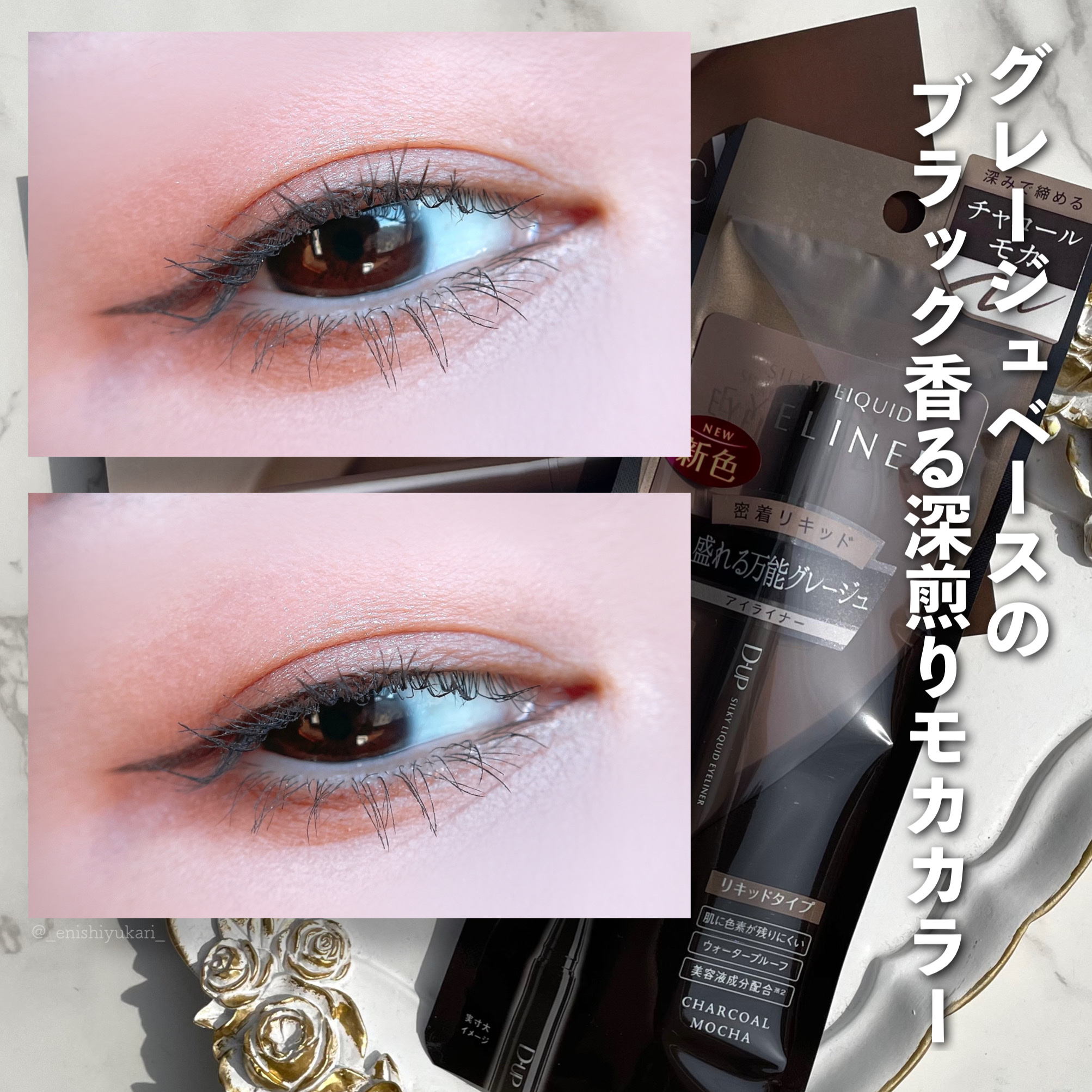滑るようになめらかな描き心地 ✔️水・汗・皮脂に強く、にじみにくい ✔️適度なコシの極細0.1mm筆先 今回の新色はチャコールモカ 誰でも似合う''万能カラー''で目元を締める''深い発色''が特徴。 一見すると普通?と思いきや この絶妙なカラーが他にはないかも。目元がぼやけることもなくていい♡