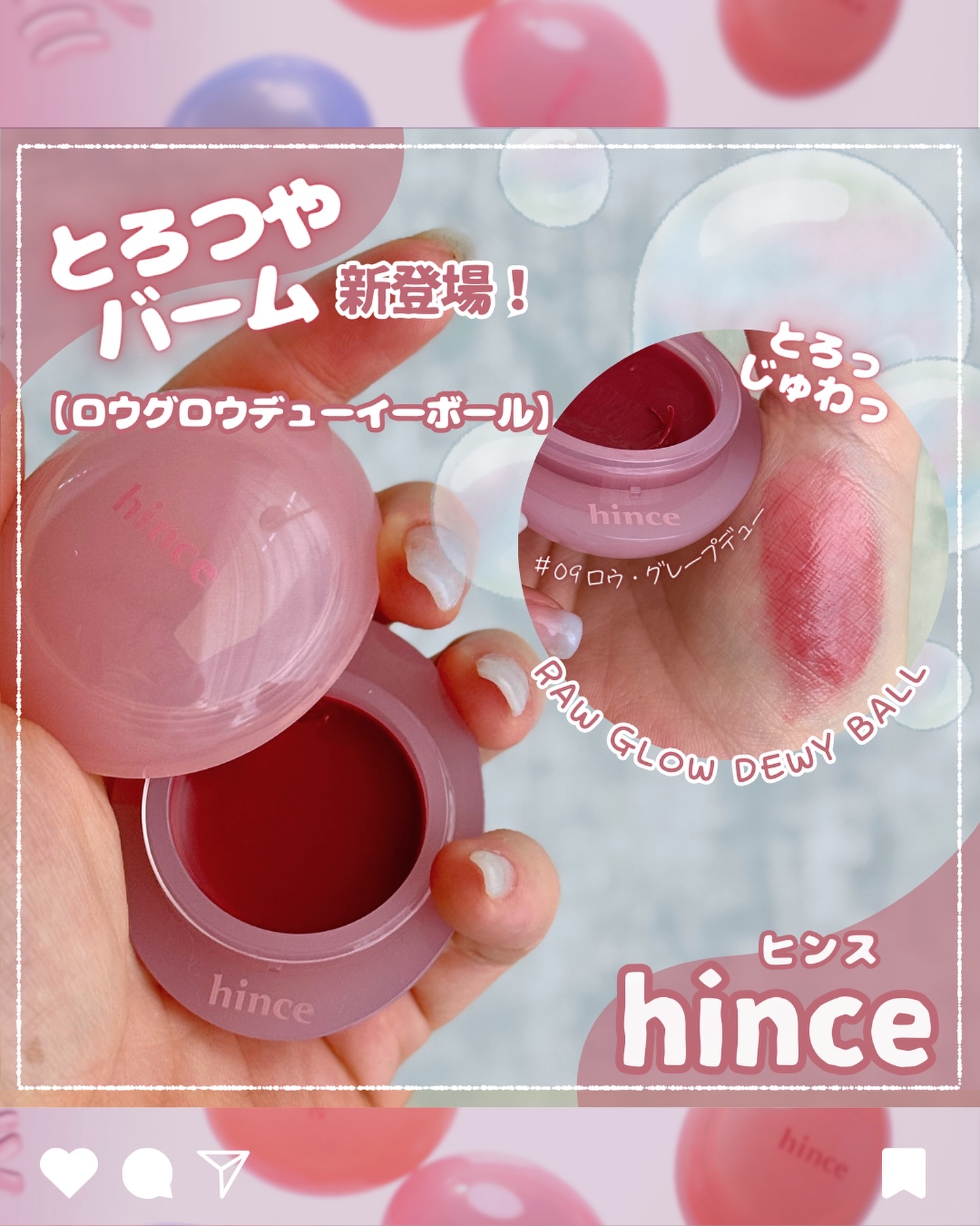 - 手のひらサイズの #しずくボール ほのかな血色感が内側から満ちる リップ&チーク マルチバーム ✓ しずくをまとったような澄んだ艶感 高屈折率の高粘度オイルで作られた透明コーティング膜で、どの角度からみても輝く澄んだしっとりしたぷるツヤリップを演出 ✓ 内側から輝く透明な血色感、リップ&チークマルチバーム べたつかないテクスチャーで、不快感なくリップとチークとして活用できるマルチバーム ✓ 好きなだけ鮮やかに、輝く高発色カラー 唇の温度で溶けることによりなめらかにレイヤリング可能 ダークニングの心配なく、もとの唇の色に影響されず綺麗に発色 ✓ 高保湿密着ケアで塗る度になめらかになる唇 86%以上のスキンコンディショニング成分とデューイーグロウヴィーガンコンプレックスが長時間ずっと唇をしっとりとさせ、弾力な保湿効果を発揮 ■発売詳細 2月27日(木) Qoo10先行発売 3月1日(土) ロフト、PLAZA、ショップイン発売 3月3日(月) 楽天発売 3月15日(土) 直営店、ZOZOCOSMEなど順次一般発売