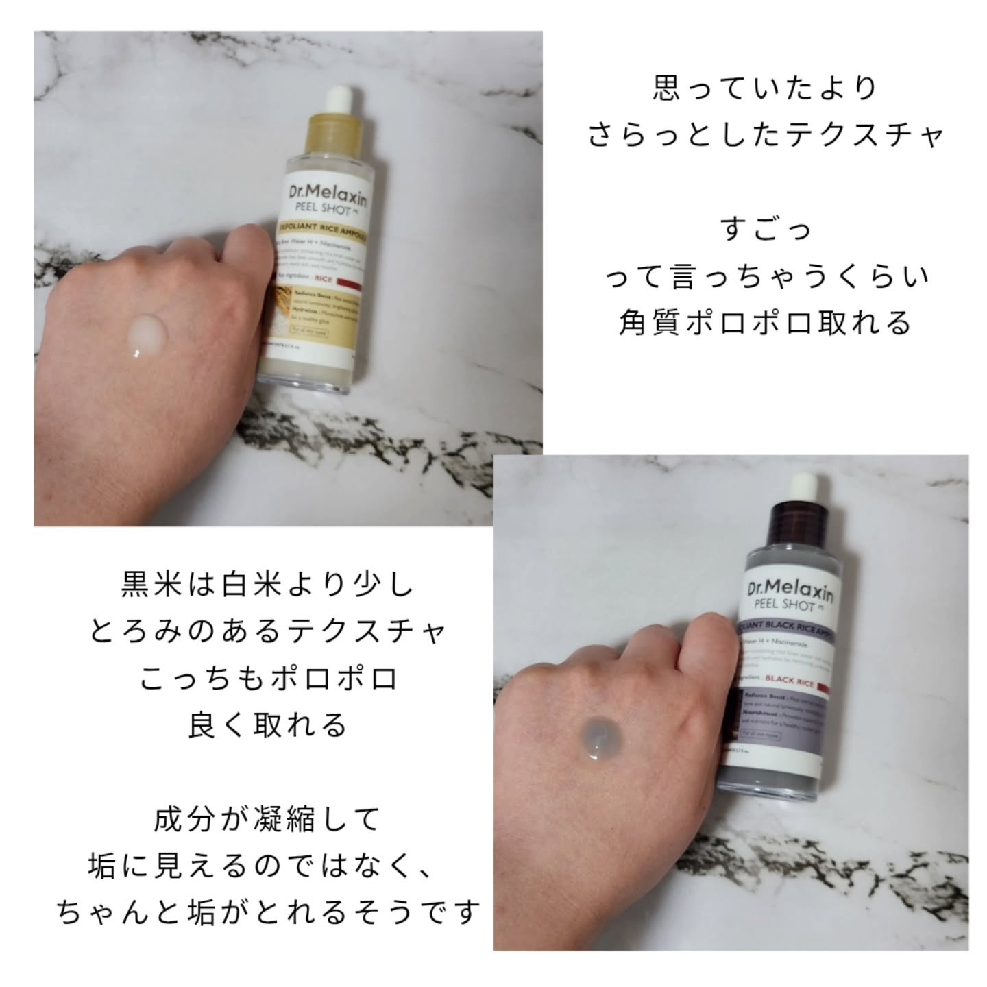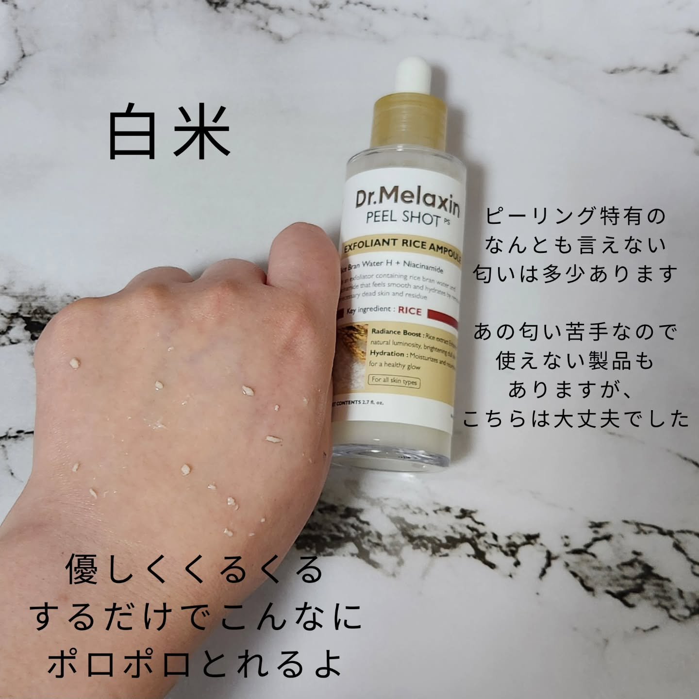 ピーリングと同時に有効成分を吸収する新概念ピーリングアンプルで、皮脂と角質をやさしく取り除き、まるでスキンケアをしたかのような使用感 Dr.Melaxinのピールショットゴマージュアンプルは実際の不要な垢がポロポロ取れるんだって。めちゃくちゃ取れたんだけど🤣🤣 ☆白米アンプル - ホワイトヘッドに悩む方におすすめ ★黒米アンプル - ブラックヘッドに悩む方におすすめ