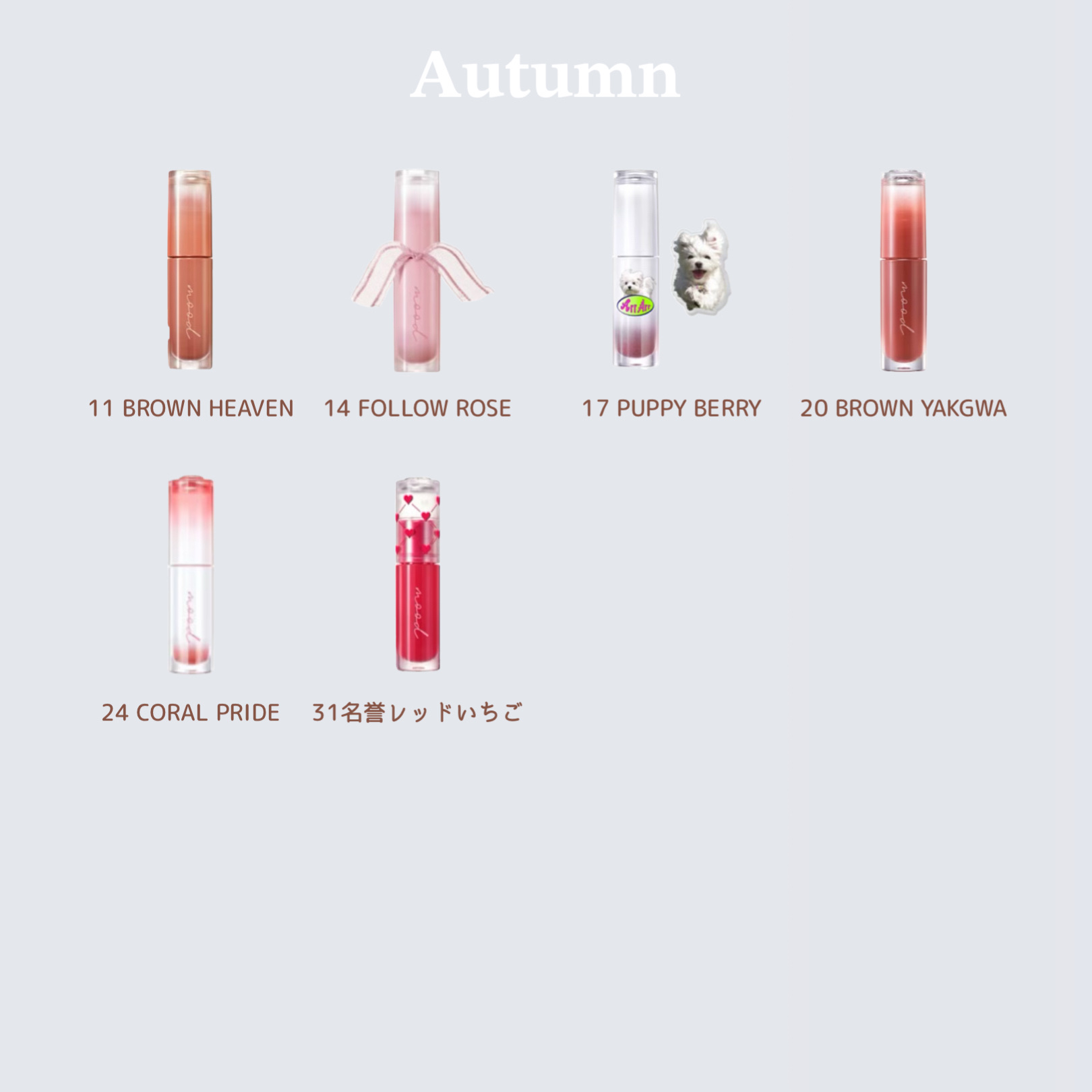 - 爽やかなムードで染まる清楚なツヤティント ツヤ感のある光沢仕上げで、華やかな唇を演出するリップティント。 うるおいを与えながらほんのり色づき、清楚で可憐なツヤリップを演出。 <【ハート盛り】シリーズ共通> ハートモチーフをあしらったキュートなパッケージにもテンションが上がります。 <03 ローズ イン マインド(いいねローズ)【ハート盛り】> イチジクに似たローズ <05 CHERRY SO WHAT(どうしたのチェリー)【ハート盛り】> クールトーンチェリーレッド <20 BROWN YAKGWA(甘いブラウン)【ハート盛り】> しっとりツヤめくチリブリック <22 PINK PRIZE(ローズ7)【ハート盛り】> ブルベすぎないクールロージーカラー <35 SPECIAL CORAL(コーラル特講)【ハート盛り】> コーラルにピンクをちょっぴり <36 PINK TEACHER(クールピンク講師)【ハート盛り】> クールトーン推しライラックピンク 【さつまいもコレクション】 <40 はちみつピンク(DALDAL PINK)(限定)> はちみつさつまいも~甘いはちみつさつまいも~糖度ぎっしり、甘々の淡いピンク <41 おさつピンク(PINK SPIRIT)(限定)> 収穫ほやほやの新鮮なおさつありますよ!おさつにミュートを1滴、くすみピンクカラー <42 とれたてピンク(MONTHLY PINK)(限定)> ピンクは今が食べ頃だよ?ちょうどよく熟した、旬のモーブピンクカラー