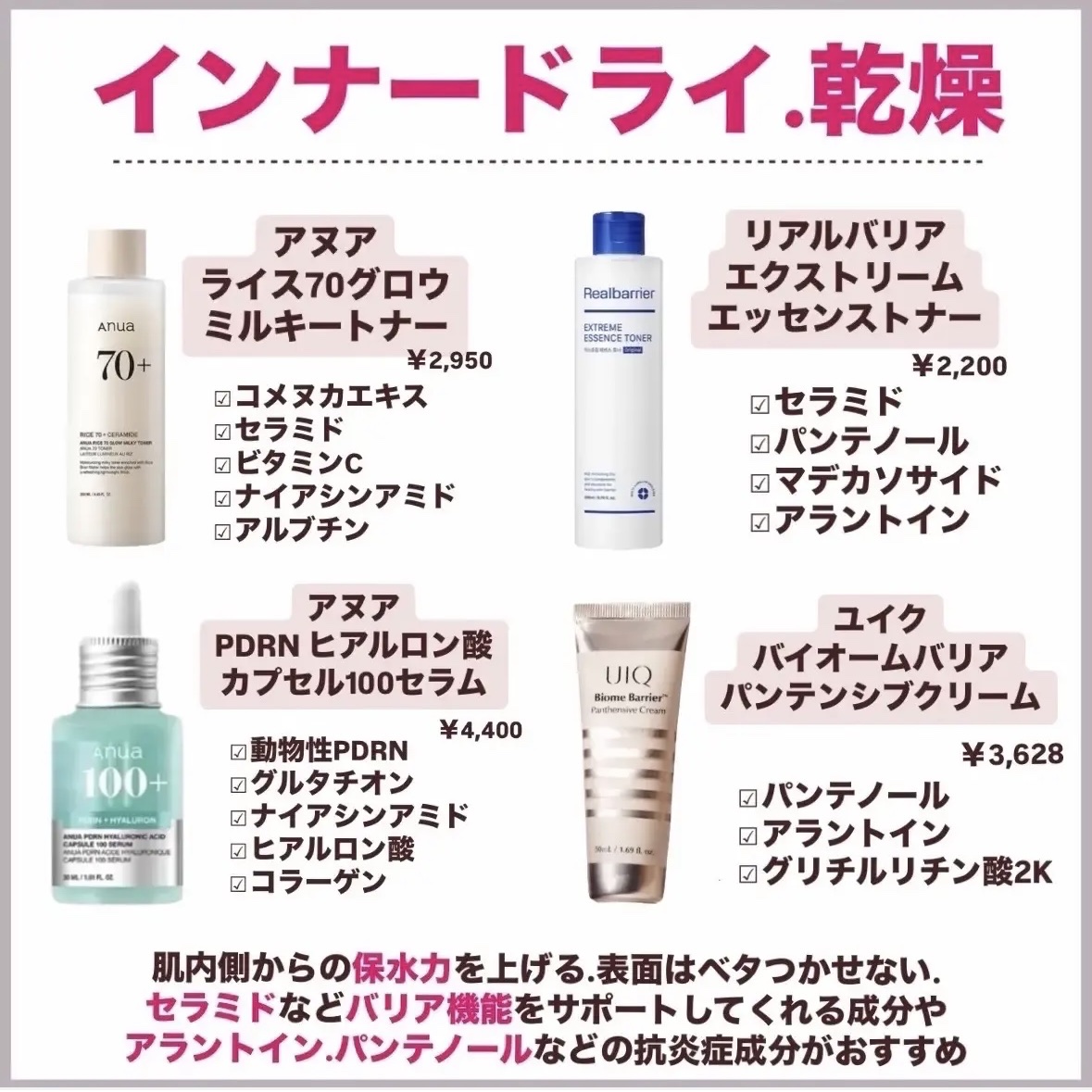 毛穴もテカリもニキビもぜーんぶ角質層の乾燥が原因? 隠れインナードライ肌続出❕ 水分と油分を上手く調節して肌に与えることで肌悩みが解決するかも! 角質層の水分量を整えてあげると、皮脂分泌量が減って必然的にテカリが抑えられたり、毛穴が目立ちにくくなったり、ニキビができにくくなったりといい事だらけなんです!