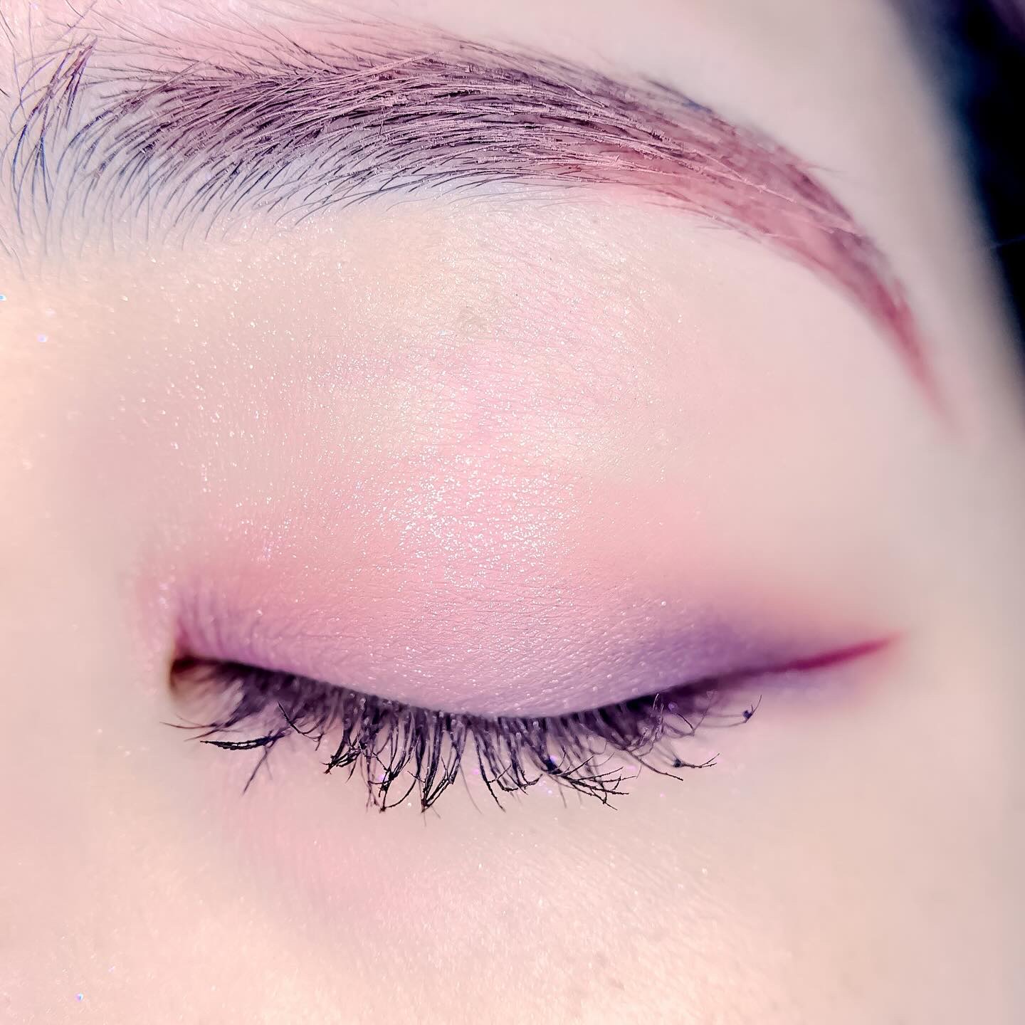 ベースに右上、目頭から黒目上に真ん中、黒目〜目尻に右下を、左上を目頭にくの字に塗ってもらいました✨ ピンクサクラよりもクールな感じで、目で見た色より私の肌では紫っぽく発色しました😍 上2つはラメはぎっしりでときめく💓 ブラウンメイクがとても苦手だけれどこれならブラウンメイク出来そう👌(かなり紫寄りですが) くすみ感は強いので苦手な方は厳しいかも…(特に真ん中) クールな印象になるので大人顔さん向けor大人顔になりたい方向けのイメージです✨