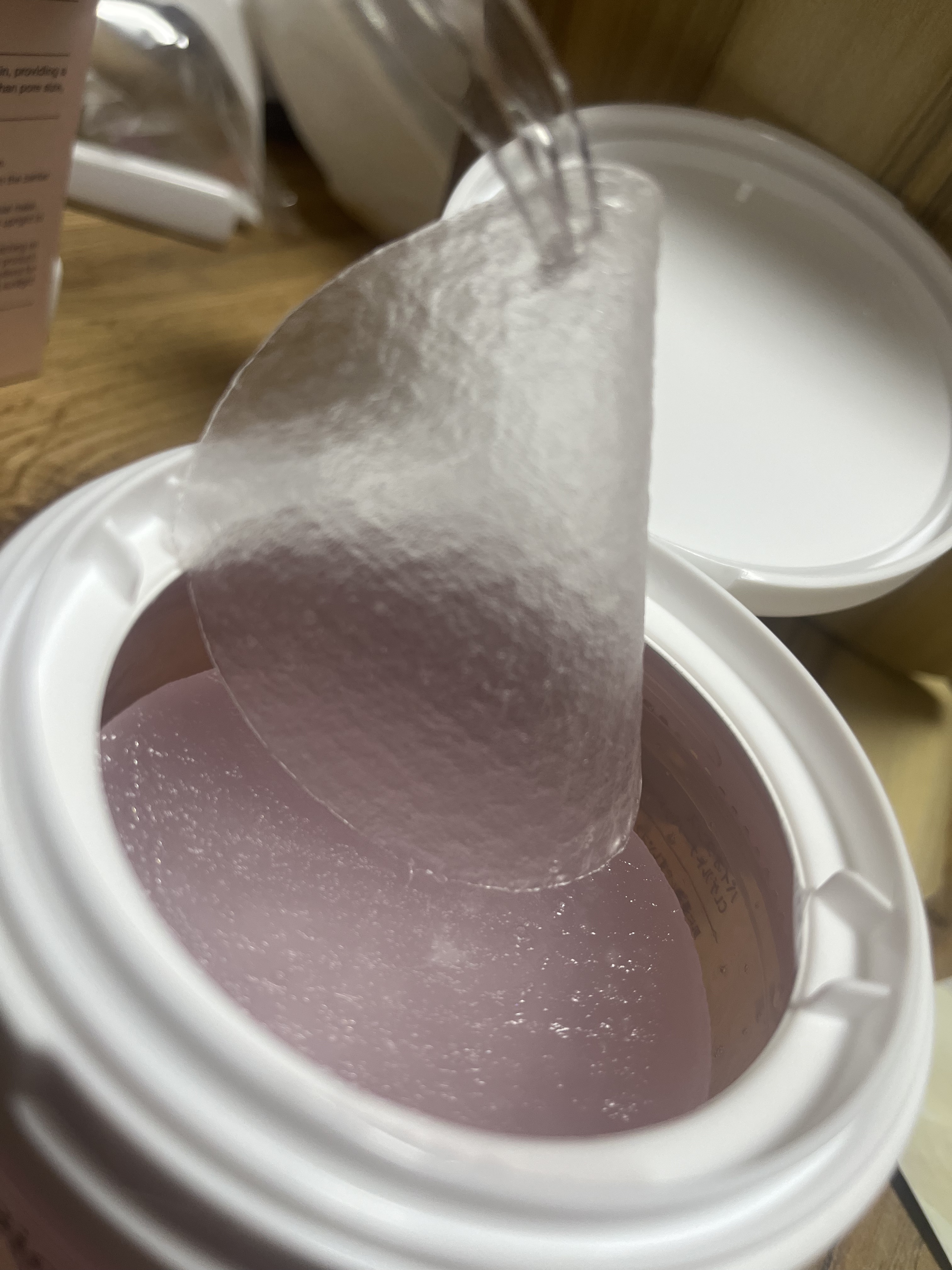 薄くてぷるぷるだから密着感は◎ パッドを5分間つけて、全体を拭き取って時間経つとわたしは少し突っ張り感があるよーな気がした😭 朝やってその後の化粧ノリは良い💄 今回はピンクの、コラーゲンver.だったけど色々種類があったので使ってみたいと思う