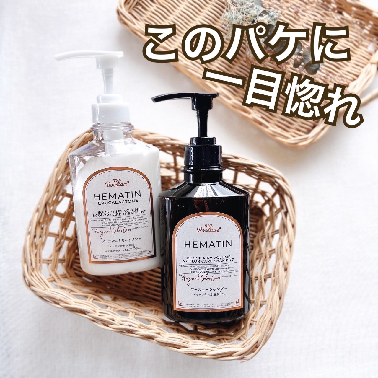 注目成分「ヘマチン」配合のシャンプー&トリートメント。色落ちケアと根元がふんわりするのに毛先がまとまる仕上がりを叶えます。 トリートメントにはヘマチンに加えて、補修成分である植物由来のエルカラクトンを3%配合。エルカラクトンはドライヤーやアイロンの熱に反応して毛髪と結合しダメージを補修、 根元がふっくらする感じに仕上がるのもお気に入りのポイント🎶 ペアー&ムスクの香りもgood✩.*˚