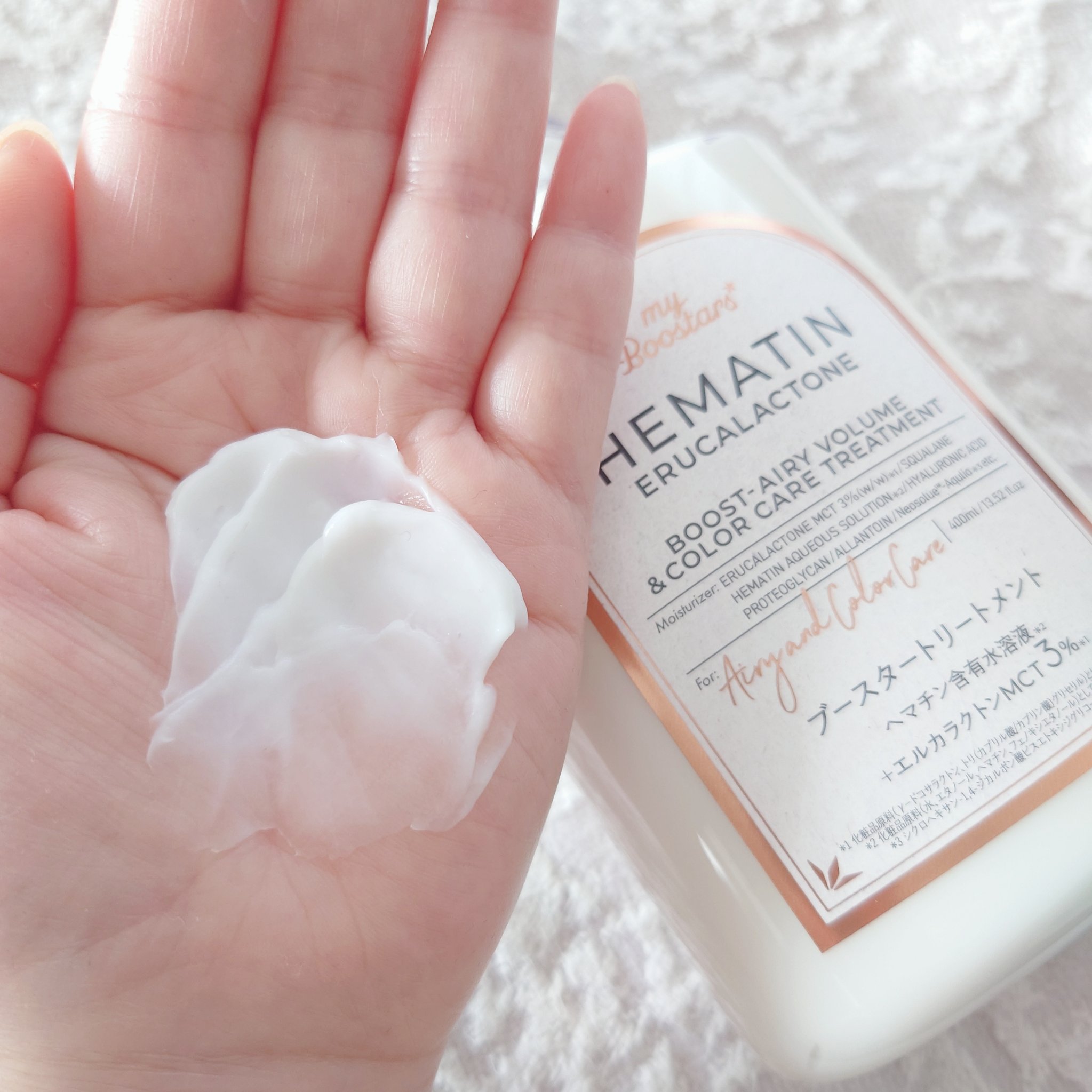 - カラーの色もちをサポートしてふんわり髪へ導く、ヘマチン(*1)配合シャンプー。根元ふんわりなのに、毛先のまとまりが続きます。ペアー&ムスクの香り。 ●ヘマチンブースト エアリー&カラーケア処方: 【ヘマチン(*1)】カラーした髪の色もちをサポート、乾燥ダメージを受けた髪を補修する 【ブースター(*2)】美容液成分(*1)の髪内部への浸透(*3)を助ける ●サルフェート・シリコーン・パラベン・鉱物油・合成着色料フリー *1 ヘマチン[毛髪補修成分] *2 シクロヘキサン-1,4-ジカルボン酸ビスエトキシジグリコール[保湿成分] *3 髪の内部まで カラーの色もちをサポートしてふんわり髪へ導く、ヘマチン(*1)配合トリートメント。根元ふんわりなのに、毛先のまとまりが続きます。ペアー&ムスクの香り。 ●ヘマチンブースト エアリー&カラーケア処方: 【ヘマチン(*1)】カラーした髪の色もちをサポート、乾燥ダメージを受けた髪を補修する 【γ-ドコサラクトン(*2)】熱反応する菜種由来の油が髪を補修してまとまりを維持する 【ブースター(*3)】美容液成分(*1)の髪内部への浸透(*4)を助ける ●サルフェート・パラベン・鉱物油・合成着色料フリー *1 ヘマチン[毛髪補修成分] *2 毛髪補修成分 *3 シクロヘキサン-1,4-ジカルボン酸ビスエトキシジグリコール[保湿成分] *4 髪の内部まで
