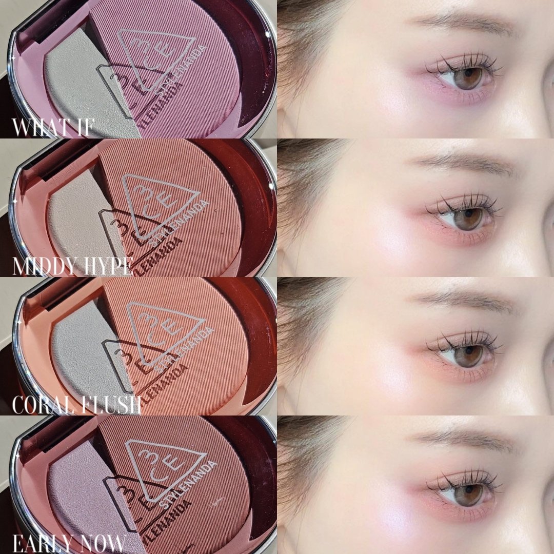 色相環をもとに計算しつくされたハイライトとチークが1つになった3CEのブラッシュライター🪄💗 カラバリは反対色のコントラストカラー4色と隣接色のグラデーションカラー3色、さらっとした質感で肌になじみ透け感があるのでどれも使いやすかった◎ 個人的には反対色のWHAT IFが儚げで好き。