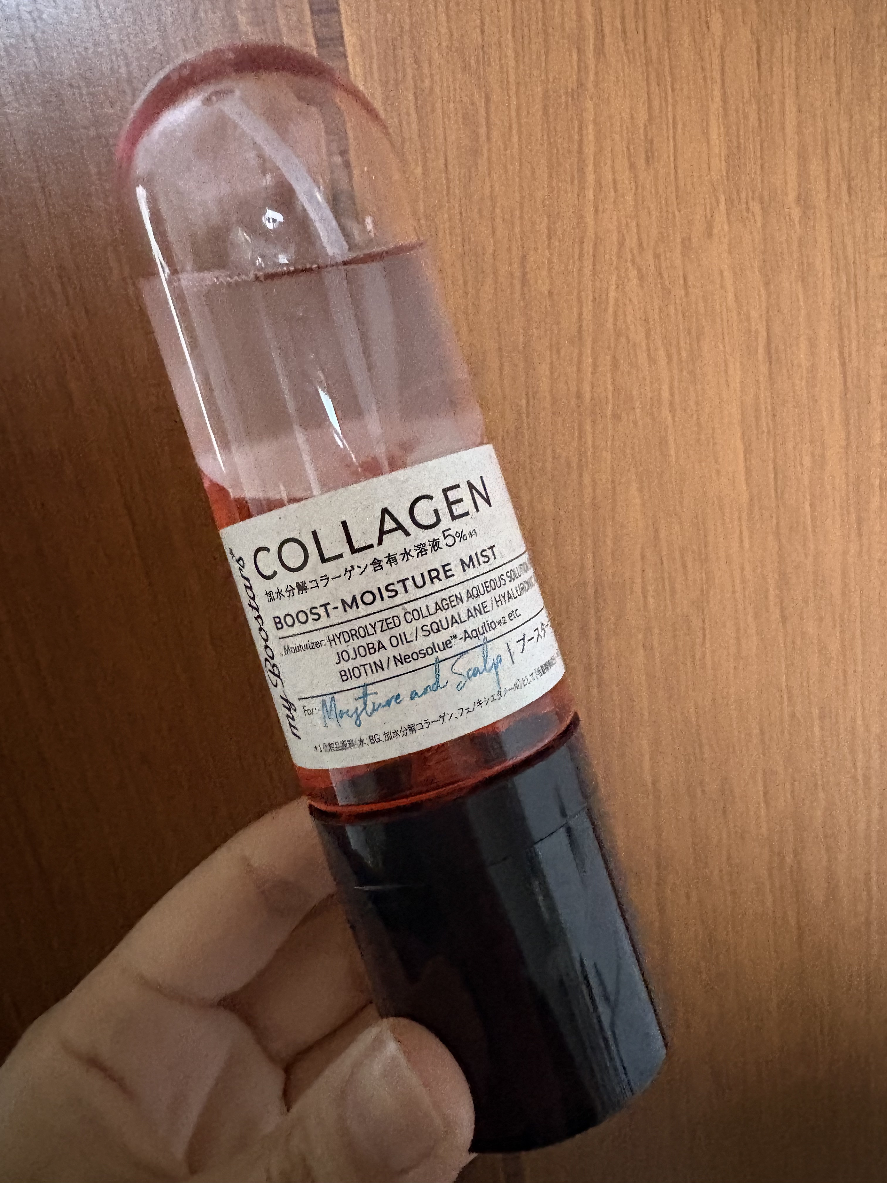 myBoostarsコラーゲンブースターミストコラーゲンの配合された導入美容液です。ピンクと透明の二層トリートメントが可愛くて、持っているだけでも気持ちが上がります。使用前に振ることでしっかりとトリートメントが混ざりました。付けた後はオイルの...