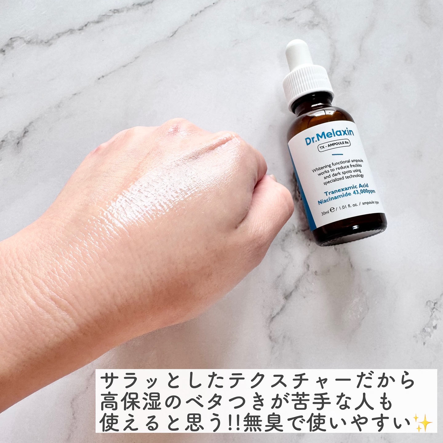 トラネキサム酸はシミの飲み薬や注射に使用されることで有名だよね🫶🏻 ナノトラネキサム酸、ナイアシンアミド 8.6%配合した美肌アプローチアンプル✨ こっくりとしたテクスチャーで肌にピタッと密着してベタつかない!