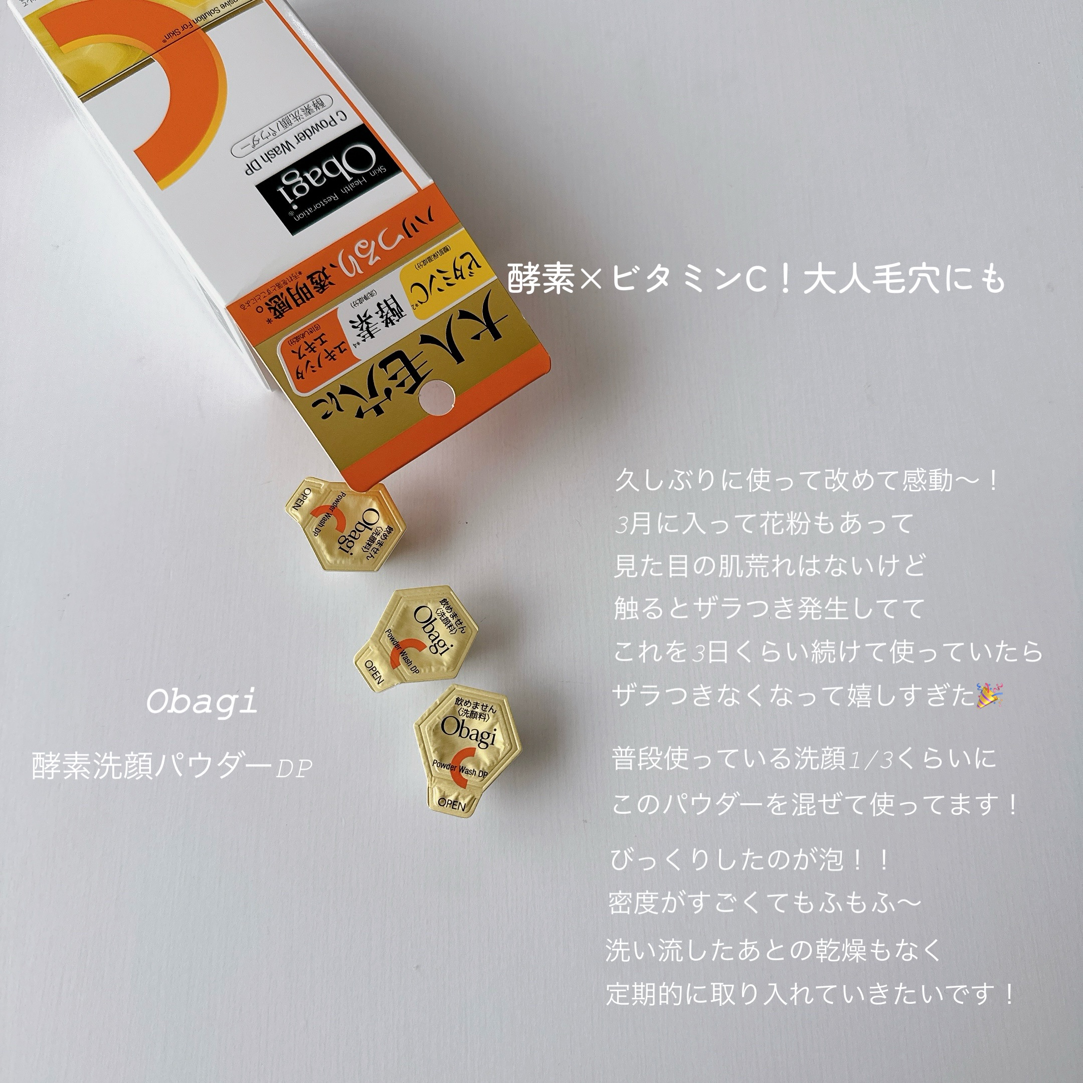- 大人の毛穴悩みに。*1毛穴の黒ずみ・角栓・ザラつきをしっかり取りのぞく、ビタミンC*2配合の酵素洗顔パウダー。 うるおってハリがある、つるりとした透明感*3あふれる肌に導きます。 オバジ独自の皮膚科学研究により、肌悩みへアプローチ (1)ビタミンC*2配合 つるりとしたなめらか肌に導きます。 (2)2種の酵素*4配合 毛穴汚れや古い角質を洗い流し、透明感のある肌に導きます。 (3)こだわりの大人毛穴ケア成分配合 ユキノシタエキス(引きしめ成分)をはじめ、大人毛穴を考えた保湿成分配合。 *1:古い角質や汚れを落として毛穴を目立たなくする *2:アスコルビン酸(整肌保湿成分) *3:汚れを落とすことによる *4:タンパク分解酵素(プロテアーゼ:洗浄成分) 皮脂分解酵素(リパーゼ:洗浄成分)