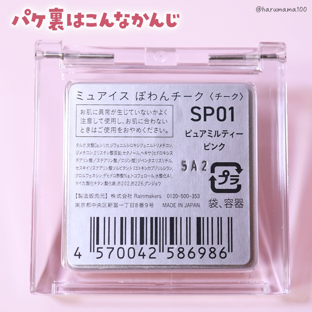- <02 ピュアビスケット> 合成フルオロフロゴパイト、酸化チタン、窒化ホウ素、シリカ、タルク、ジメチコン、ナイロン-12、パーフルオロヘキシルエチルトリエトキシシラン、水酸化Al、トリ(カプリル酸/カプリン酸)グリセリル、ジフェニルシロキシフェニルトリメチコン、セスキイソステアリン酸ソルビタン、ステアリン酸、ワセリン、クロルフェネシン、デヒドロ酢酸Na、トコフェロール、塩化Al、マイカ、グンジョウ、酸化鉄 <03 ばぶみピンク> タルク、炭酸Ca、ジフェニルシロキシフェニルトリメチコン、シリカ、ジメチコン、ミリスチン酸亜鉛、ヘキサ(ヒドロキシステアリン酸/ステアリン酸/ロジン酸)ジペンタエリスリチル、セタノール、セスキイソステアリン酸ソルビタン、トリエトキシカプリリルシラン、クロルフェネシン、デヒドロ酢酸Na、水酸化Al、トコフェロール、マイカ、酸化チタン、酸化鉄、グンジョウ、赤226 <04 ピュアミルティーピンク(旧:SP01 ピュアミルティーピンク)> タルク、炭酸Ca、シリカ、ジフェニルシロキシフェニルトリメチコン、ジメチコン、ミリスチン酸亜鉛、セタノール、ヘキサ(ヒドロキシステアリン酸/ステアリン酸/ ロジン酸)ジペンタエリスリチル、セスキイソステアリン酸ソルビタン、トリエトキシカプリリルシラン、クロルフェネシン、デヒドロ酢酸Na、トコフェロール、水酸化Al、マイカ、酸化チタン、酸化鉄、赤202、赤226、グンジョウ <PN01 コットンメロリーナ(ピーナッツコラボ)(限定) > タルク、ジフェニルシロキシフェニルトリメチコン、シリカ、ジメチコン、炭酸Ca、ミリスチン酸亜鉛、セタノール、ヘキサ(ヒドロキシステアリン酸/ステアリン酸/ロジン酸)ジペンタエリスリチル、セスキイソステアリン酸ソルビタン、クロルフェネシン、デヒドロ酢酸Na、トコフェロール、水酸化Al、マイカ、酸化鉄、グンジョウ、赤226、黄4、酸化チタン <PN02 ベビメロピンク(ピーナッツコラボ)(限定) > タルク、炭酸Ca、ジフェニルシロキシフェニルトリメチコン、シリカ、ジメチコン、ミリスチン酸亜鉛、ヘキサ(ヒドロキシステアリン酸/ステアリン酸/ロジン酸)ジペンタエリスリチル、セタノール、セスキイソステアリン酸ソルビタン、トリエトキシカプリリルシラン、クロルフェネシン、デヒドロ酢酸Na、トコフェロール、マイカ、酸化チタン、赤226、グンジョウ、酸化鉄、水酸化Al <01 デートローズ> 合成フルオロフロゴパイト、窒化ホウ素、シリカ、酸化チタン、タルク、ジメチコン、ナイロン-12、パーフルオロヘキシルエチルトリエトキシシラン、水酸化Al、トリ(カプリル酸/カプリン酸)グリセリル、ジフェニルシロキシフェニルトリメチコン、セスキイソステアリン酸ソルビタン、ワセリン、ステアリン酸、クロルフェネシン、デヒドロ酢酸Na、トコフェロール、塩化Al、マイカ、酸化鉄、赤226、グンジョウ <SP02 ダスティドライローズ(限定)> タルク、炭酸Ca、シリカ、ジフェニルシロキシフェニルトリメチコン、ジメチコン、ミリスチン酸亜鉛、セタノール、ヘキサ(ヒドロキシステアリン酸/ステアリン酸/ロジン酸)ジペンタエリスリチル、セスキイソステアリン酸ソルビタン、トリエトキシカプリリルシラン、クロルフェネシン、デヒドロ酢酸Na、トコフェロール、マイカ、酸化チタン、酸化鉄、グンジョウ、赤226、赤202
