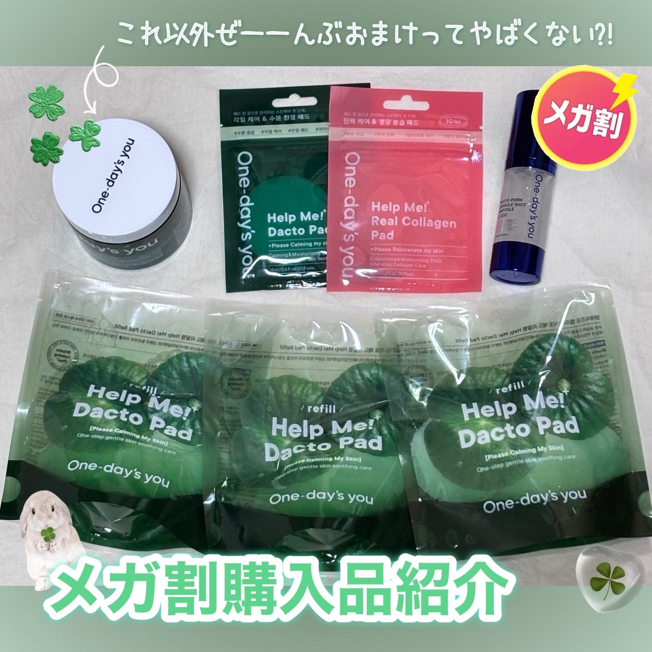 敏感肌でもOKOne-day'syouヘルプミー!ダクトパッドトナーパッドといえば、敏感肌には不向きなイメージ…。One-day'syouのダクトパッドはツボクサエキス配合なので、保湿ケアで、敏感肌さんこそ使って欲しい♡エンボス加工された面で...