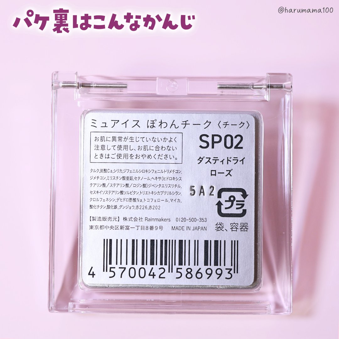 - <02 ピュアビスケット> 合成フルオロフロゴパイト、酸化チタン、窒化ホウ素、シリカ、タルク、ジメチコン、ナイロン-12、パーフルオロヘキシルエチルトリエトキシシラン、水酸化Al、トリ(カプリル酸/カプリン酸)グリセリル、ジフェニルシロキシフェニルトリメチコン、セスキイソステアリン酸ソルビタン、ステアリン酸、ワセリン、クロルフェネシン、デヒドロ酢酸Na、トコフェロール、塩化Al、マイカ、グンジョウ、酸化鉄 <03 ばぶみピンク> タルク、炭酸Ca、ジフェニルシロキシフェニルトリメチコン、シリカ、ジメチコン、ミリスチン酸亜鉛、ヘキサ(ヒドロキシステアリン酸/ステアリン酸/ロジン酸)ジペンタエリスリチル、セタノール、セスキイソステアリン酸ソルビタン、トリエトキシカプリリルシラン、クロルフェネシン、デヒドロ酢酸Na、水酸化Al、トコフェロール、マイカ、酸化チタン、酸化鉄、グンジョウ、赤226 <04 ピュアミルティーピンク(旧:SP01 ピュアミルティーピンク)> タルク、炭酸Ca、シリカ、ジフェニルシロキシフェニルトリメチコン、ジメチコン、ミリスチン酸亜鉛、セタノール、ヘキサ(ヒドロキシステアリン酸/ステアリン酸/ ロジン酸)ジペンタエリスリチル、セスキイソステアリン酸ソルビタン、トリエトキシカプリリルシラン、クロルフェネシン、デヒドロ酢酸Na、トコフェロール、水酸化Al、マイカ、酸化チタン、酸化鉄、赤202、赤226、グンジョウ <PN01 コットンメロリーナ(ピーナッツコラボ)(限定) > タルク、ジフェニルシロキシフェニルトリメチコン、シリカ、ジメチコン、炭酸Ca、ミリスチン酸亜鉛、セタノール、ヘキサ(ヒドロキシステアリン酸/ステアリン酸/ロジン酸)ジペンタエリスリチル、セスキイソステアリン酸ソルビタン、クロルフェネシン、デヒドロ酢酸Na、トコフェロール、水酸化Al、マイカ、酸化鉄、グンジョウ、赤226、黄4、酸化チタン <PN02 ベビメロピンク(ピーナッツコラボ)(限定) > タルク、炭酸Ca、ジフェニルシロキシフェニルトリメチコン、シリカ、ジメチコン、ミリスチン酸亜鉛、ヘキサ(ヒドロキシステアリン酸/ステアリン酸/ロジン酸)ジペンタエリスリチル、セタノール、セスキイソステアリン酸ソルビタン、トリエトキシカプリリルシラン、クロルフェネシン、デヒドロ酢酸Na、トコフェロール、マイカ、酸化チタン、赤226、グンジョウ、酸化鉄、水酸化Al <01 デートローズ> 合成フルオロフロゴパイト、窒化ホウ素、シリカ、酸化チタン、タルク、ジメチコン、ナイロン-12、パーフルオロヘキシルエチルトリエトキシシラン、水酸化Al、トリ(カプリル酸/カプリン酸)グリセリル、ジフェニルシロキシフェニルトリメチコン、セスキイソステアリン酸ソルビタン、ワセリン、ステアリン酸、クロルフェネシン、デヒドロ酢酸Na、トコフェロール、塩化Al、マイカ、酸化鉄、赤226、グンジョウ <SP02 ダスティドライローズ(限定)> タルク、炭酸Ca、シリカ、ジフェニルシロキシフェニルトリメチコン、ジメチコン、ミリスチン酸亜鉛、セタノール、ヘキサ(ヒドロキシステアリン酸/ステアリン酸/ロジン酸)ジペンタエリスリチル、セスキイソステアリン酸ソルビタン、トリエトキシカプリリルシラン、クロルフェネシン、デヒドロ酢酸Na、トコフェロール、マイカ、酸化チタン、酸化鉄、グンジョウ、赤226、赤202