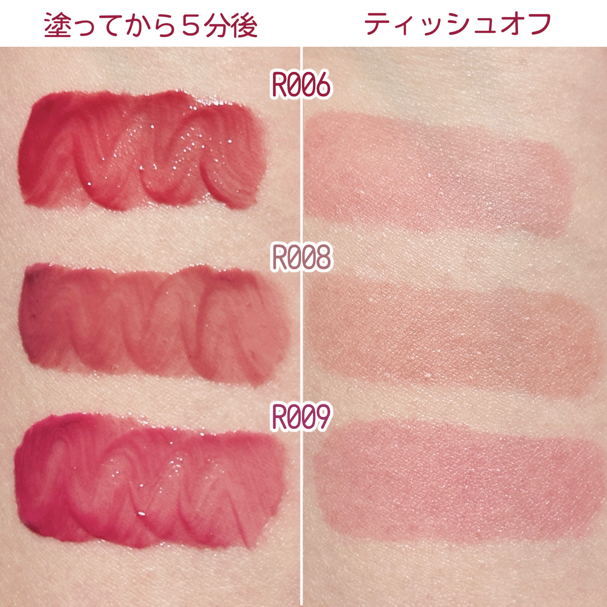 - <R001 ベア> 水、ジフェニルジメチコン、オクチルドデカノール、ビスジグリセリルポリアシルアジペート-2、リンゴ酸ジイソステアリル、トリメチルシロキシフェニルジメチコン、水添ポリイソブテン、ジグリセリン、ポリソルベート60、BG、セチルPEG/PPG-10/1ジメチコン、1,2-ヘキサンジオール、ペンチレングリコール、(アクリル酸ヒドロキシエチル/アクリロイルジメチルタウリンNa)コポリマー、セテアレス-20、スクワラン、フェノキシエタノール、酸化チタン、香料、エチルヘキシルグリセリン、黄5、赤227、イソステアリン酸ソルビタン、水酸化Al、ポリアクリル酸アンモニウム、酢酸トコフェロール、黄4、青1、ヒアルロン酸Na、(アルギニン/リシン)ポリペプチド、加水分解ヒアルロン酸、トコフェロール、アセチルヒアルロン酸Na、ソルビン酸 <R002 ロウローズ> 水、ジフェニルジメチコン、オクチルドデカノール、ビスジグリセリルポリアシルアジペート-2、リンゴ酸ジイソステアリル、トリメチルシロキシフェニルジメチコン、水添ポリイソブテン、ジグリセリン、ポリソルベート60、BG、セチルPEG/PPG-10/1ジメチコン、1,2-ヘキサンジオール、ペンチレングリコール、(アクリル酸ヒドロキシエチル/アクリロイルジメチルタウリンNa)コポリマー、セテアレス-20、スクワラン、フェノキシエタノール、酸化チタン、香料、エチルヘキシルグリセリン、黄5、赤227、イソステアリン酸ソルビタン、酢酸トコフェロール、水酸化Al、ポリアクリル酸アンモニウム、ヒアルロン酸Na、青1、加水分解ヒアルロン酸、(アルギニン/リシン)ポリペプチド、トコフェロール、アセチルヒアルロン酸Na、ソルビン酸 <R003 ロウプリコット> 水、ジフェニルジメチコン、オクチルドデカノール、ビスジグリセリルポリアシルアジペート-2、リンゴ酸ジイソステアリル、トリメチルシロキシフェニルジメチコン、水添ポリイソブテン、ジグリセリン、ポリソルベート60、BG、セチルPEG/PPG-10/1ジメチコン、1,2-ヘキサンジオール、ペンチレングリコール、(アクリル酸ヒドロキシエチル/アクリロイルジメチルタウリンNa)コポリマー、セテアレス-20、スクワラン、フェノキシエタノール、香料、エチルヘキシルグリセリン、酸化チタン、黄5、イソステアリン酸ソルビタン、赤227、酢酸トコフェロール、ヒアルロン酸Na、水酸化Al、ポリアクリル酸アンモニウム、加水分解ヒアルロン酸、青1、(アルギニン/リシン)ポリペプチド、トコフェロール、アセチルヒアルロン酸Na、ソルビン酸 <R004 フィーバー> 水、ジフェニルジメチコン、オクチルドデカノール、リンゴ酸ジイソステアリル、ビスジグリセリルポリアシルアジペート-2、トリメチルシロキシフェニルジメチコン、水添ポリイソブテン、ジグリセリン、ポリソルベート60、BG、セチルPEG/PPG-10/1ジメチコン、1,2-ヘキサンジオール、ペンチレングリコール、(アクリル酸ヒドロキシエチル/アクリロイルジメチルタウリンNa)コポリマー、セテアレス-20、スクワラン、フェノキシエタノール、香料、エチルヘキシルグリセリン、黄5、赤227、イソステアリン酸ソルビタン、酢酸トコフェロール、ヒアルロン酸Na、加水分解ヒアルロン酸、(アルギニン/リシン)ポリペプチド、トコフェロール、アセチルヒアルロン酸Na、ソルビン酸 <R005 ハイビスカス> 水、ジフェニルジメチコン、オクチルドデカノール、ビスジグリセリルポリアシルアジペート-2、リンゴ酸ジイソステアリル、トリメチルシロキシフェニルジメチコン、水添ポリイソブテン、ジグリセリン、ポリソルベート60、BG、セチルPEG/PPG-10/1ジメチコン、1,2-ヘキサンジオール、ペンチレングリコール、アクリル酸ヒドロキシエチル/アクリロイルジメチルタウリンNa)コポリマー、セテアレス-20、スクワラン、フェノキシエタノール、香料、エチルヘキシルグリセリン、赤227、黄5、イソステアリン酸ソルビタン、赤104(1)、酢酸トコフェロール、ヒアルロン酸Na、加水分解ヒアルロン酸、(アルギニン/リシン)ポリペプチド、トコフェロール、アセチルヒアルロン酸Na、ソルビン酸 <R006 ロウグレープ> 水、ジフェニルジメチコン、ビスジグリセリルポリアシルアジペート-2、リンゴ酸ジイソステアリル、オクチルドデカノール、トリメチルシロキシフェニルジメチコン、水添ポリイソブテン、ジグリセリン、ポリソルベート60、BG、セチルPEG/PPG-10/1ジメチコン、1,2-ヘキサンジオール、ペンチレングリコール、(アクリル酸ヒドロキシエチル/アクリロイルジメチルタウリンNa)コポリマー、セテアレス-20、スクワラン、酸化チタン、フェノキシエタノール、香料、エチルヘキシルグリセリン、黄5、赤227、イソステアリン酸ソルビタン、水酸化Al、ポリアクリル酸アンモニウム、酢酸トコフェロール、ヒアルロン酸Na、青1、加水分解ヒアルロン酸、(アルギニン/リシン)ポリペプチド、トコフェロール、アセチルヒアルロン酸Na、ソルビン酸 <R007 チル> 水、ジフェニルジメチコン、オクチルドデカノール、ビスジ