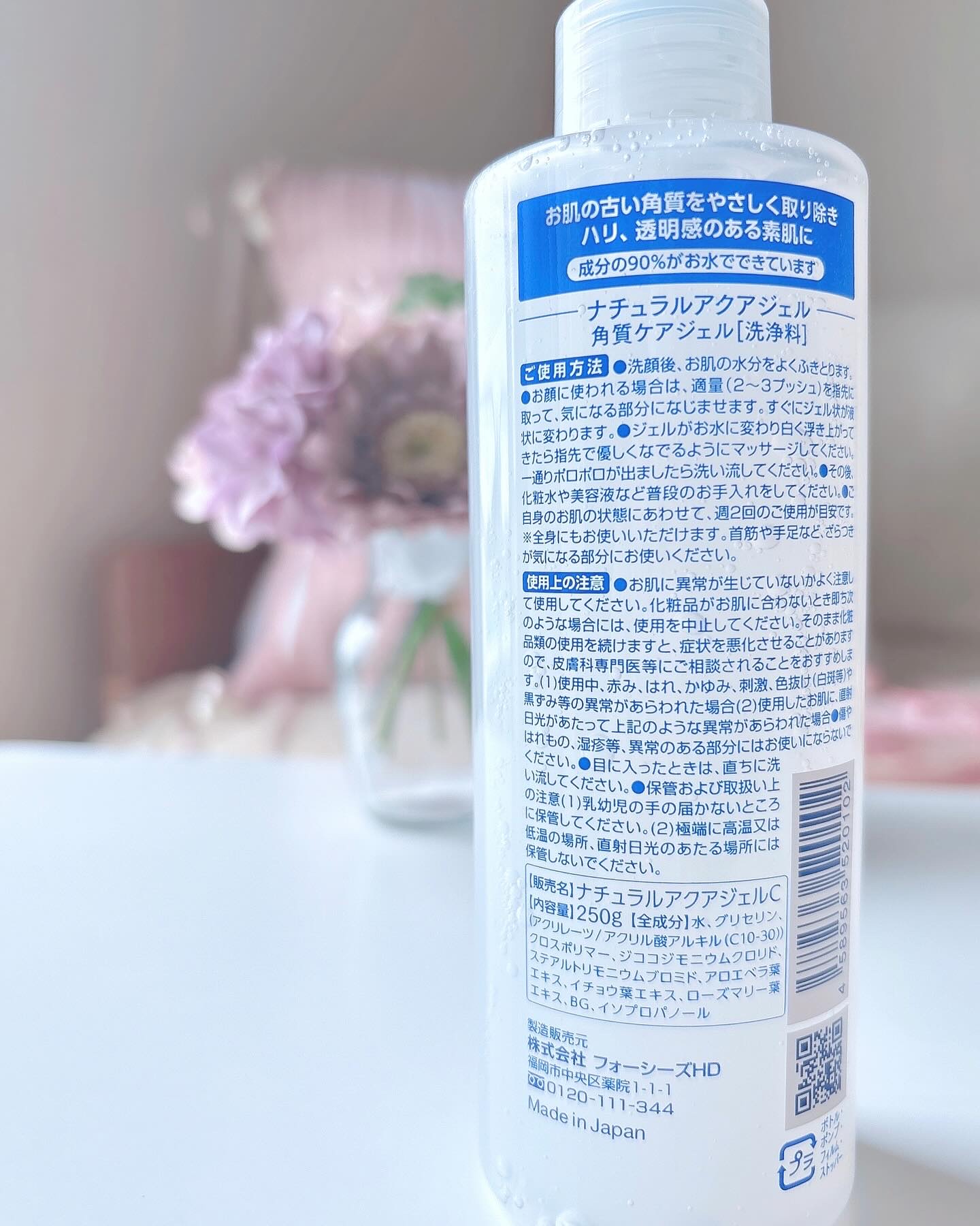 - 週2回の角質ケアで素肌つるん。 肌のお手入れで大切なことは、キレイに「落とす」こと。 メイクや皮脂汚れを落とすように、古くなった角質を取り除くことは、キレイな肌を保つためには、大切なお手入れです。 ナチュラルアクアジェルは、成分の約90%が水でできています。 もちろん、無香料・無着色・無防腐剤。 肌に塗って、くるくるやさしくマッサージするだけで、ジェルが古い角質と反応してポロポロと余分な角質をやさしく除去します。 肌に負担をかけずにやさしくマッサージすることで、毎日の洗顔だけでは取り除くことの出来ない古い角質を除去します。 週に2回の角質ケアで美容成分の浸透を高め、毎日のお手入れがもっと効果的になります。