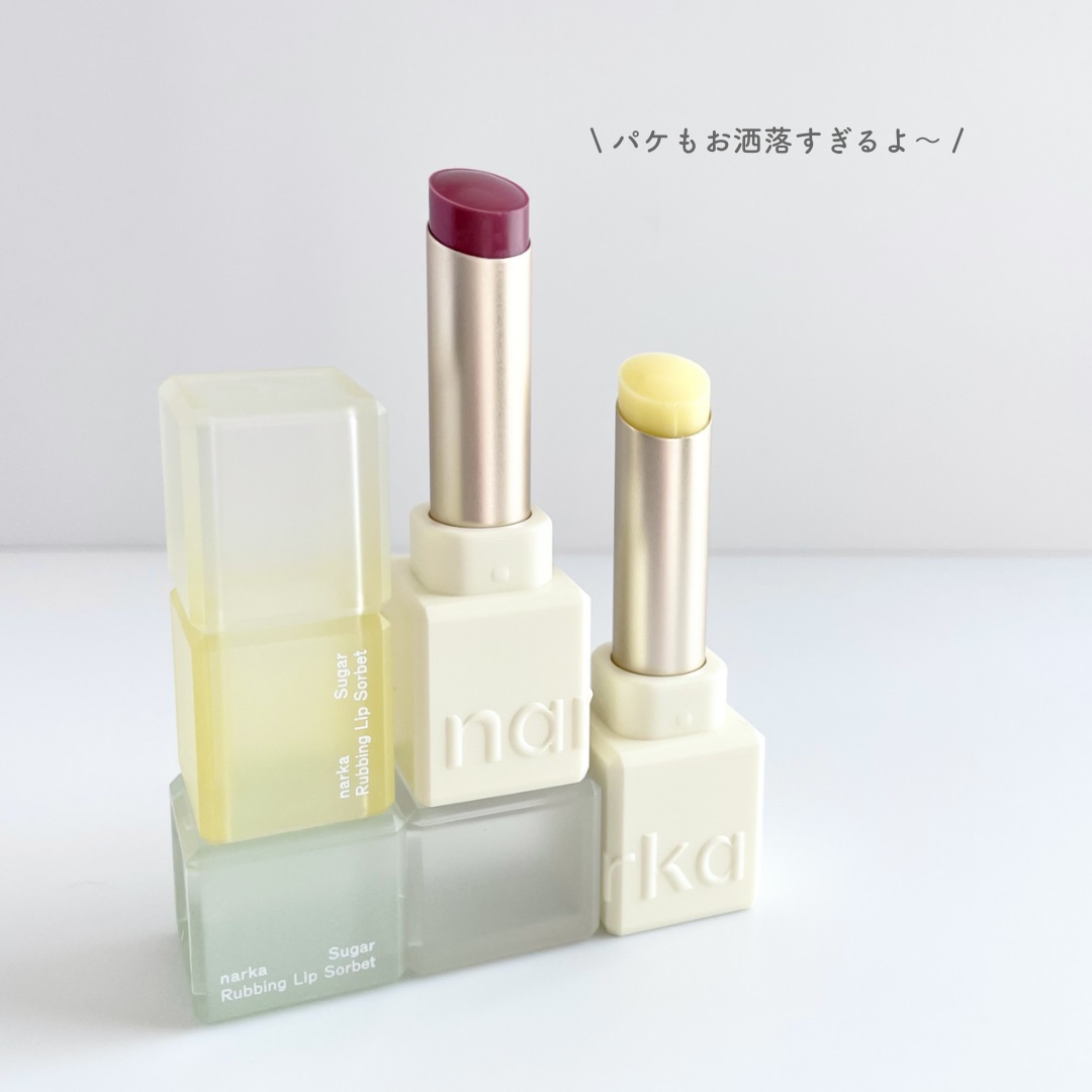 ナルカシュガーラビングリップソルベリップコンディションのケアができるナルカのリップソルベ✨スティックタイプだから手軽にリップの角質ケアとカラーケアが同時にできるよ!スウォッチは00レモンマーマレードと03ロゼモカです✨00は夜寝る前とかメイク...