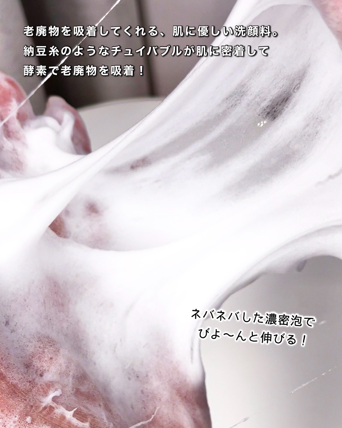 - 肌に触れるたび、ふわっと弾むような濃密泡。 納豆の糸のように伸びるユニークなテクスチャーが肌にぴたりと密着し、やさしい使い心地で洗い上げます。 パパイン酵素*とコーンスターチ*が肌表面の不要な角質や汚れを取り除き、ガラクトミセス培養液*のうるおいでなめらかな肌へ。 洗い流した後も、肌にしっとりとしたうるおい感を。 *すべて整肌成分/原料の特性に限ります <特長成分> ・ガラクトミセス培養液:整肌成分 ・ナットウガム:テクスチャー調整成分 発酵由来の成分が肌をすこやかに保ち、キメのあるなめらかな印象へ ・パパイン酵素:整肌成分 ・コーンスターチ:吸着成分* 不要な角質をやさしい使い心地でオフし、すっきりとした洗い上がりへ *上記の内容は原料の特性に限ります ・3種の植物由来エキス:整肌成分 オクラ果実エキス、ヤマノイモ根エキス、ワカメエキスが、肌を整え、なめらかな仕上がりへ ・加水分解コラーゲン:保湿成分 うるおいを補い、しっとりとした肌へ ・大豆発酵エキス:整肌成分 大豆由来の成分が肌をなめらかに整え、すこやかな状態をキープ <テクスチャー&香り> テクスチャー ・きめ細かく泡立つパウダー洗顔テクスチャー ・もっちりのびる弾力泡 香り 無香料 色 白色