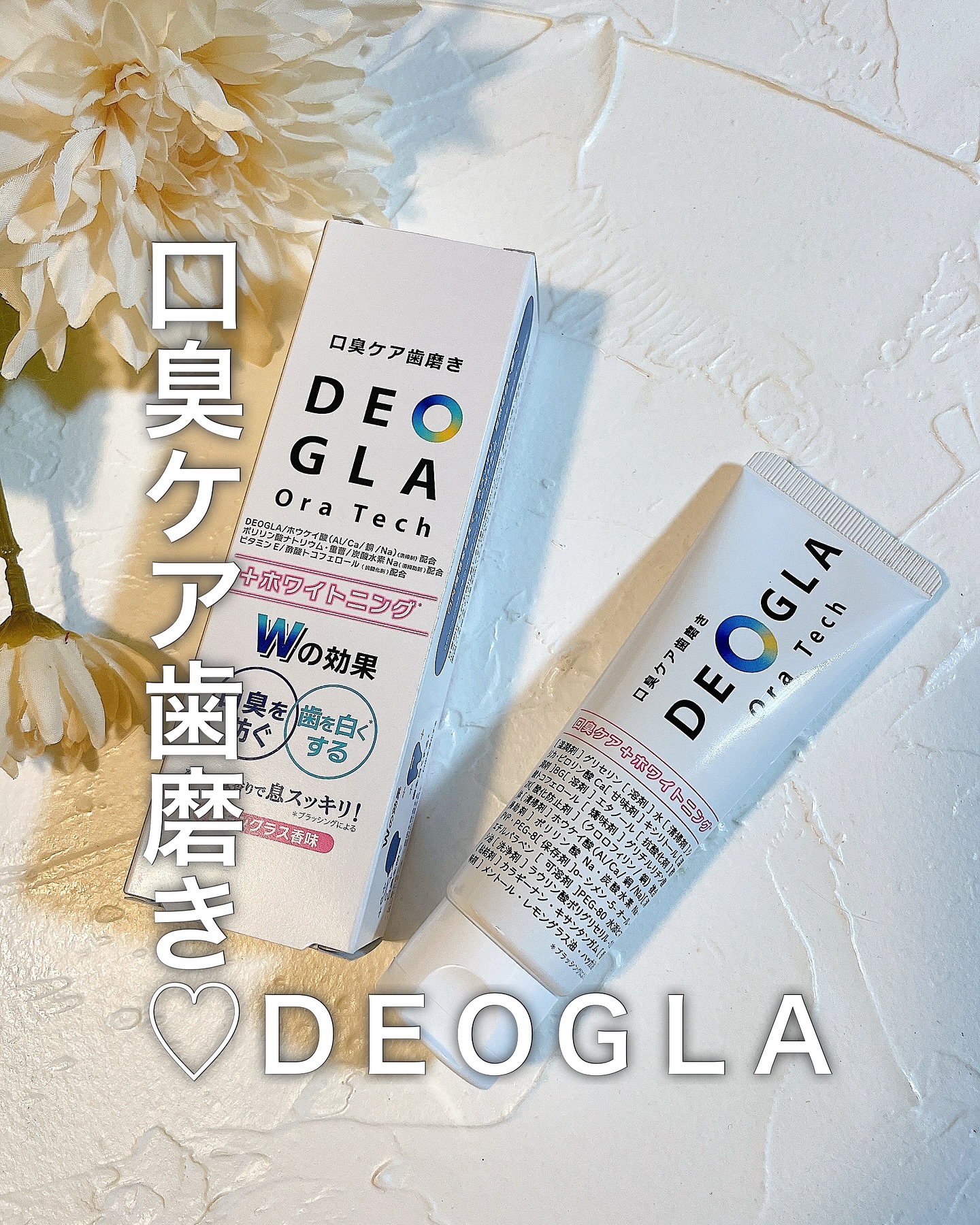 - \独自成分「DEOGLA®︎」(清掃剤)配合/ 創業200年を超える素材メーカーがつくる口臭ケアに特化した歯磨き粉! 製品の特長: 多数のご要望をいただいていた、口臭とホワイトニング *を1本でケアいただけます。ホワイトニング *はもちろん、独自成分DEOGLA配合で口臭にアプローチ。 徹底的にこだわった成分を配合しているので、口臭ケアとしてだけでなくお口のトータルケアにご活用ください。 ミントが苦手な方にもおすすめな、レモングラス香味、控え目な泡立ちでしっかりとブラッシングしていただけます。 ▶独自成分DEOGLA : 化粧品成分名称 ホウケイ酸(Al/Ca/銅/Na) *ブラッシングによる