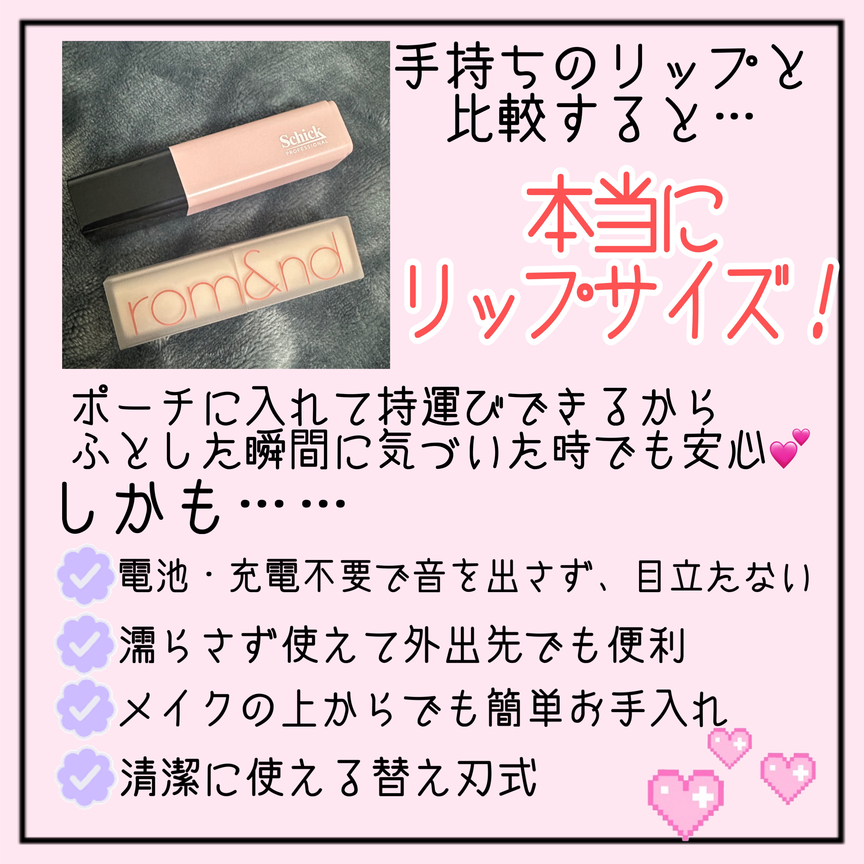 - 気になるうぶ毛や剃り残しをいつでもどこでも瞬間ケア! ポイント1:メイクの上からでも剃れる肌のことを考えた3枚の密着マイクロ刃 └顔回りの柔らかいうぶ毛や、指や剃り残した体毛もしっかりキャッチ。刃を濡らさずシェービング。 ポイント2:気になる電動音なし!メイク直し感覚でいつでもどこでも簡単ケア └充電、電池不要で使用できる軽量なコンパクトシェーバー。 ポイント3:約1.7cmのコンパクトヘッド └剃りやすい角度で固定された横幅約1.7cmのコンパクトヘッドは、小回りがききやすく眉下や口回り、指など細く狭い場所でも剃り残しなくさっと整えられます。