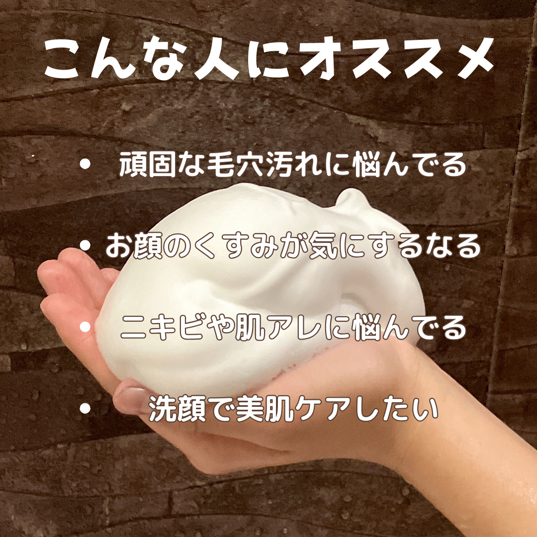 酵素とクレイの洗浄力に加えて、汚れを溶かす'AHA酸'を新配合しているんだって! モコモコでモッチモチな濃密泡がすぐに出てきます。 泡切れも良いから朝の忙しい時間にぴったりです。