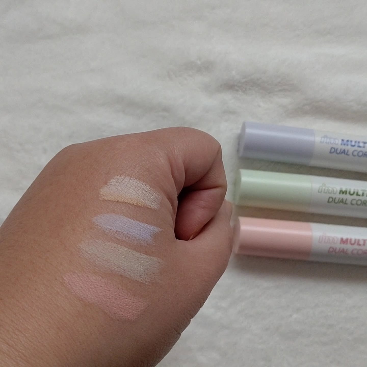カラー×ハイライト感覚コンシーラーの新しいデュアルスティック♡⃛ 描いた感じもとーってもなめらか♡⃛ 001トーンアップコレクティング 自然な血色感でくすみを飛ばすソフトピンク 迷ったらコレ⋆꙳ 子どものお支度手伝いしながらメイクしてる時って、わたしは極力手を汚したくない!