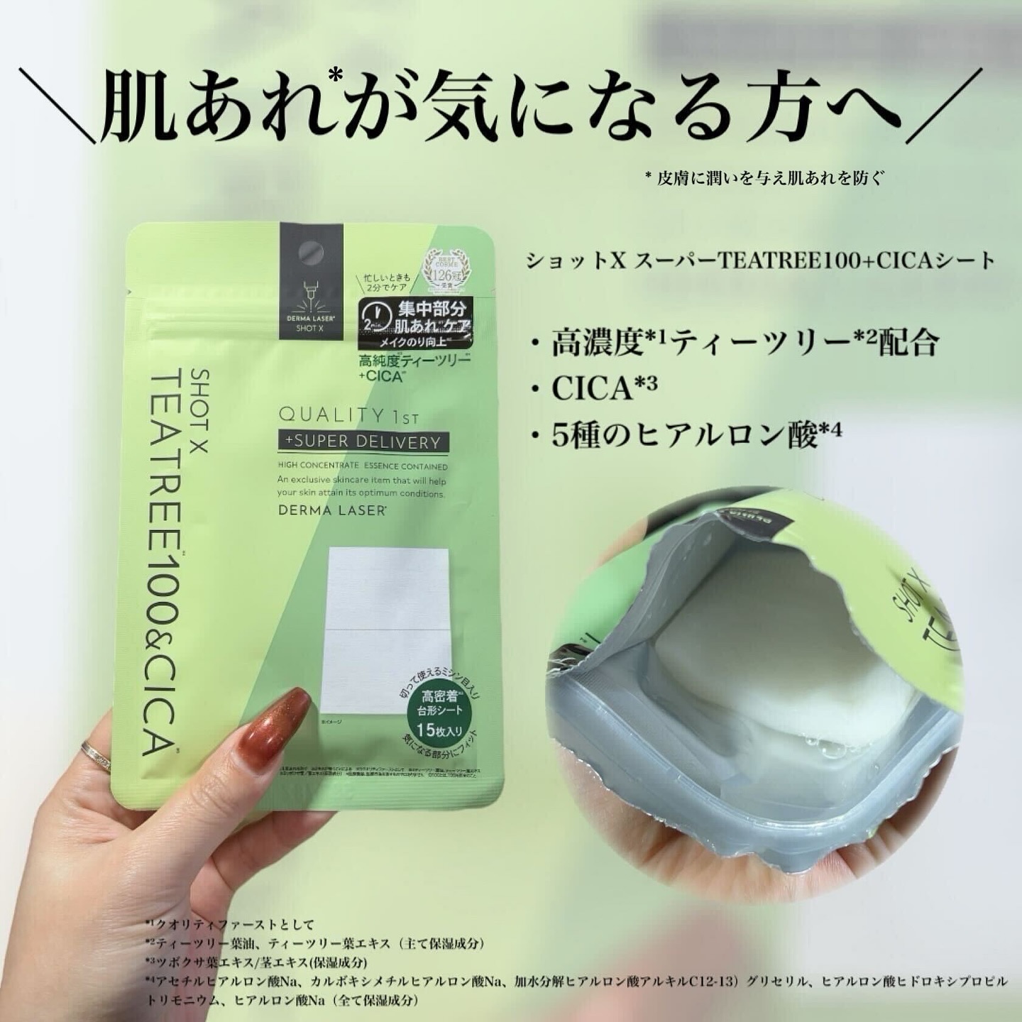 ダーマレーザーの好きなところって成分がほんとに豪華でコスパがいいところ! これは肌に乗せて2分でOKだから忙しい朝のスキンケアにもおすすめだよ🙆♀️ 3月1日からスーパーVC100シートはロフト・プラザで 3月10日からTEATREE100+CICAシートはドンキで、先行発売しているのでぜひチェックしてみてね◎ ダーマレーザー ショットX スーパーVC100シート 15枚入り / 660円(税込)