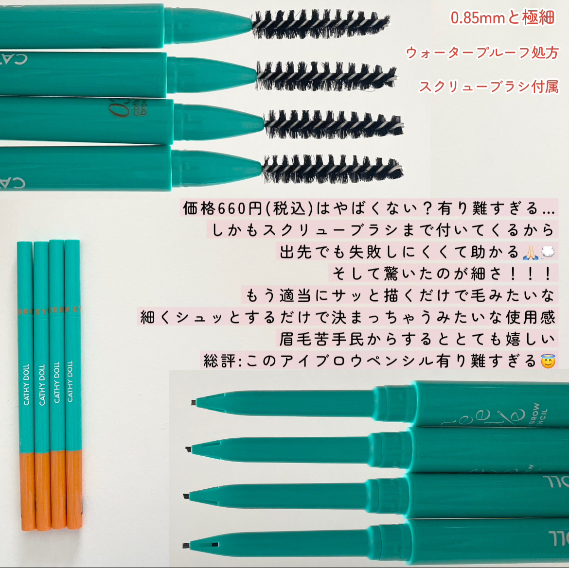 - まるで針先のような超極細芯アイブロウペンシル「Cathy Doll ニードルアイブロウペンシル」が登場! 0.85mmの超極細ペンシルは驚くほど自然な眉を描け、まるで自眉毛のような繊細な仕上がりに。力を入れずにするすると描ける美発色で自然に仕上がるから、初心者さんや男性にもおすすめです。 汗・水・皮脂に強く、消えやすい眉尻もきれいな仕上がりを長時間キープ。 日本人の肌にも馴染みやすく、幅広い髪色に対応する4色展開での発売です。