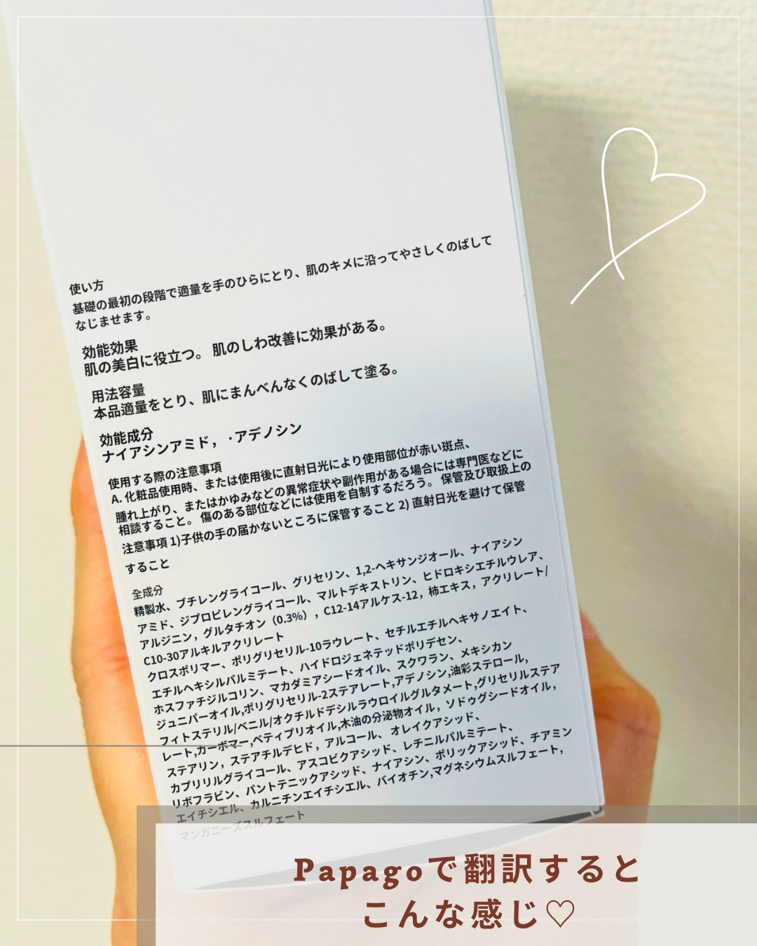 - <200ml> 水、BG、グリセリン、1,2-ヘキサンジオール、ナイアシンアミド、ジプロピレングリコール、マルトデキストリン、ヒドロキシエチルウレア、アルギニン、グルタチオン、(C12-14)アルケス-12、カキ果実エキス、(アクリレーツ/アクリル酸アルキル(C10-30))クロスポリマー、ラウリン酸ポリグリセリル-10、エチルヘキサン酸セチル、パルミチン酸エチルヘキシル、水添ポリデセン、ホスファチジルコリン、マカデミアナッツ油、スクワラン、ジュニペルスメキシカナ油、ステアリン酸ポリグリセリル-2、アデノシン、アブラナ種子ステロール、コレステロール、ラウロイルグルタミン酸ジ(オクチルドデシル/フィトステリル/ベヘニル)、ステアリン酸グリセリル、カルボマー、ベチベル根油、シベリアモミ油、ショウズク種子油、ステアリルアルコール、水添レシチン、(ジメチコン/ビニルジメチコン)クロスポリマー、(メチルビニルエーテル/マレイン酸)コポリマー、ヒドロキシアセトフェノン、ヒアルロン酸Na、ポリグルタミン酸、セラミドNP、ヒドロキシエチルセルロース、ステアリン酸、トコフェロール,EDTA-2Na、エチルヘキシルグリセリン、オレイン酸、カプリリルグリコール、アスコルビン酸、パルミチン酸レチニル、リボフラビン、パントテン酸、ナイアシン、葉酸、チアミン塩酸塩、カルニチン塩酸塩、ビオチン、硫酸マグネシウム、硫酸マンガン