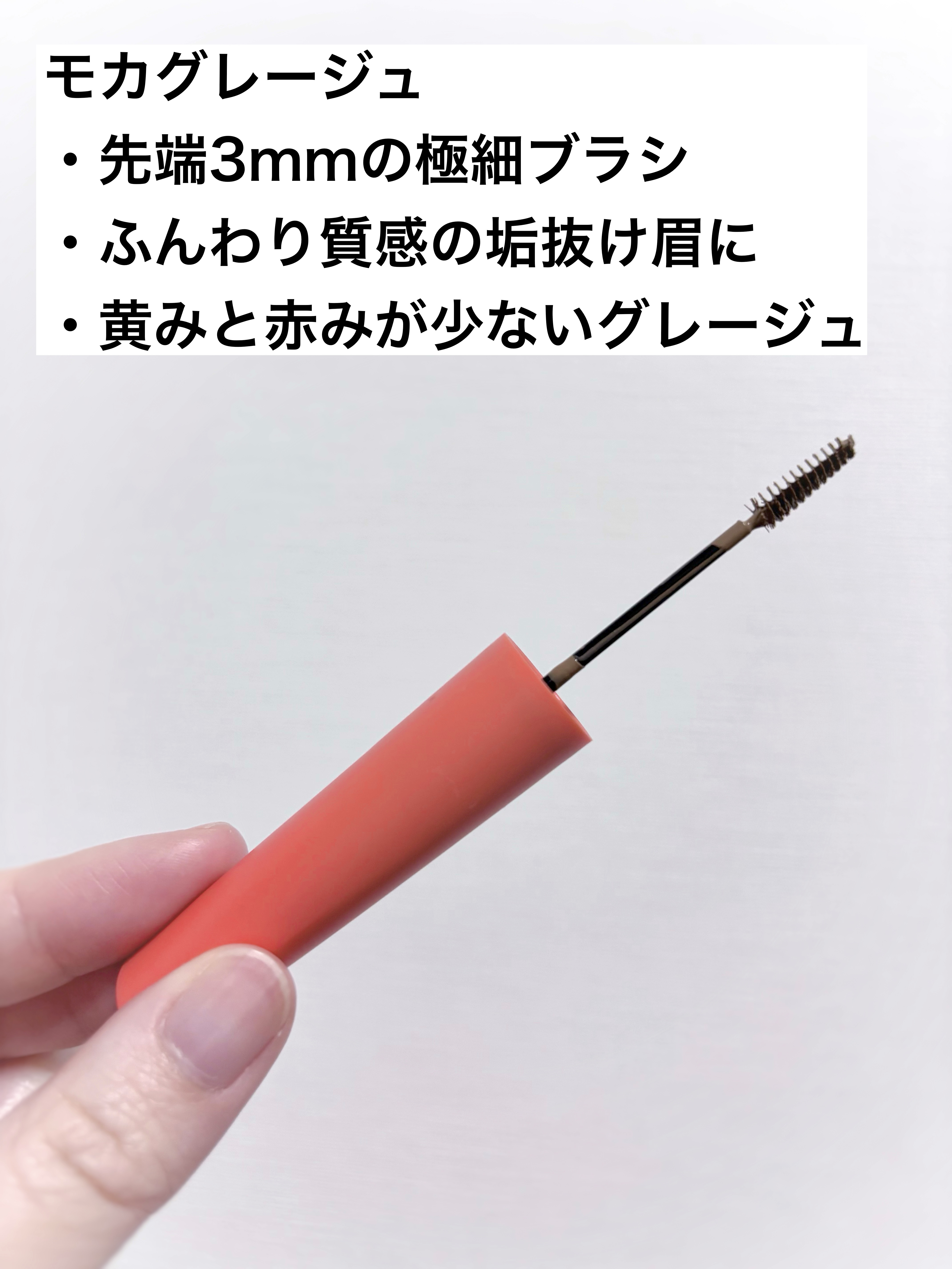 - \\25年3月定番新色モカグレージュ発売// 「フィルム眉カラー」なら眉の印象を自然にやわらげ、ふんわり質感の垢抜け眉に! 1.塗りやすい極小ブラシ ・ 先端直径3mmで、地肌に液がつきにくく根元から色づける ・余分な液がつかない設計で、ティッシュオフ不要 2.眉専用フィルム液 ・眉毛1本1本にキレイに色付き、自眉の黒さをやわらげる ・タバになったり、パリッと固まったりせず、まるで自眉のような仕上がり ・皮脂・汗・こすれに強いのにお湯で簡単オフ (※2025年9月以降、商品パッケージをリニューアル。)