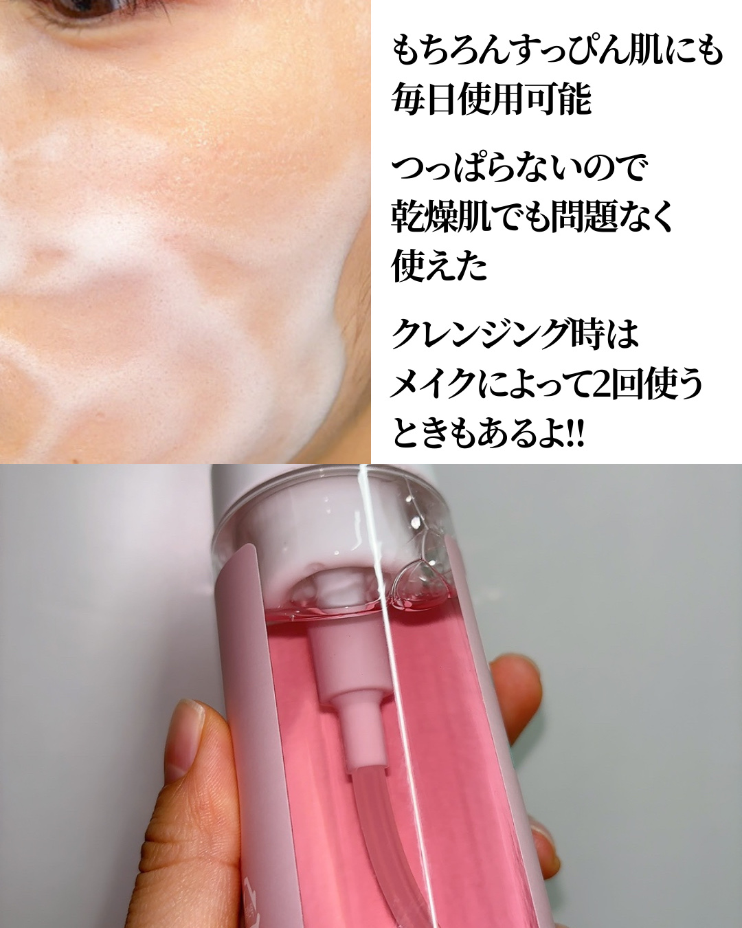 メイクだけを落とすバブルクレンザー🆕 カラミン➡️肌荒れ防止、敏感になった肌を落ち着かせる 2in1で洗顔までできるので肌への負担を考えられてるのが嬉しい! 泡だけで落とすので肌への摩擦を減らし毛穴汚れまで落とす💧