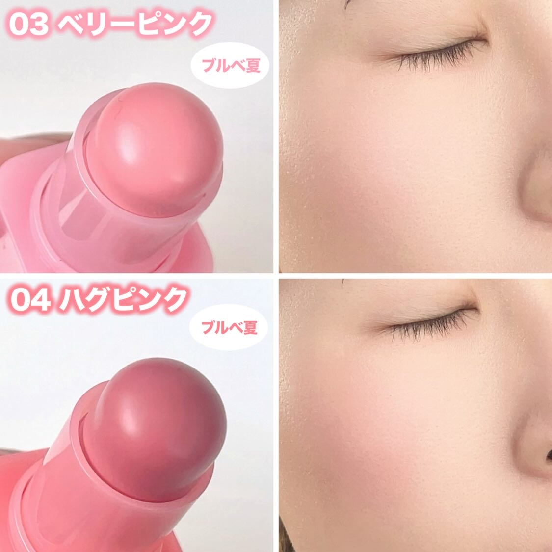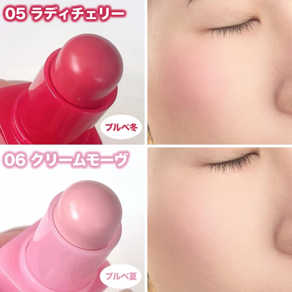 雲のようにふわふわで柔らかいテクスチャー。 軽い塗り心地でサッと塗ってトントンぼかすとベースが崩れることなく自然に染まる🫶🏻️ ふんわりタッチだからいつでもどこでも簡単に仕上がり手のひらサイズのスティックで持ち運びにも便利! 05と06が推しカラーでチークに使うのがお気に入り🫶🏻️