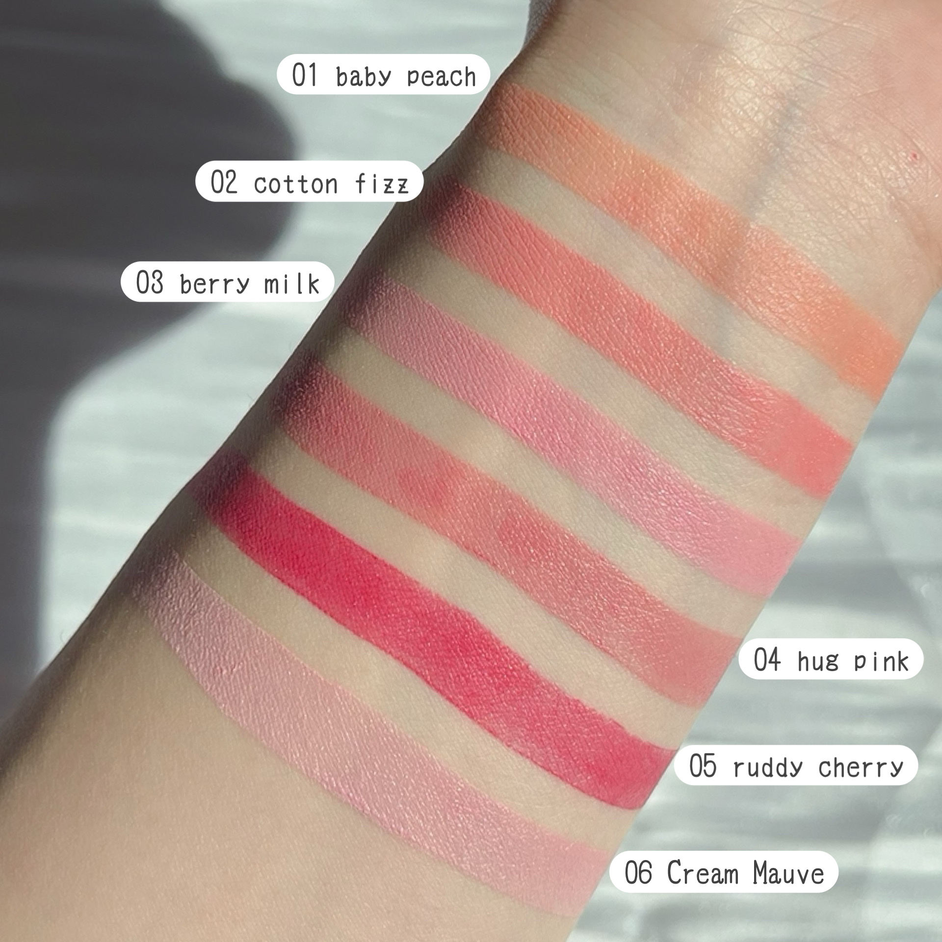 正直に言うと、、、色選び失敗したかも笑腕にスウォッチすると可愛いのに、唇にのせるとくすんだよ😭 でもリップティントのPHOLSがめっちゃお気に入り👄 リップスティックの方は硬めで、しっかりつく感じ💡秋にぴったりなおしゃれな色🍁CHARLIEはかなり茶、SCOTTはそれよりも明るめ、MIAはCHARLIEやSCOTTに比べてピンク系! リップティントはふわふわでよく伸びる〜チップについた分を全部塗ると濃くつきすぎちゃう💦チップの先だけでオッケー🙆♀️つけ心地めっちゃ好き♡PHOLSがニュートラルなお色だと思う!鮮やかな色が得意な人におおすめです💓FRANはベリー系。ちょっと私には濃かったな。SHUAHはPHOLSと似たようなお色味だけど、SHUAHの方がオレンジ強め🍊