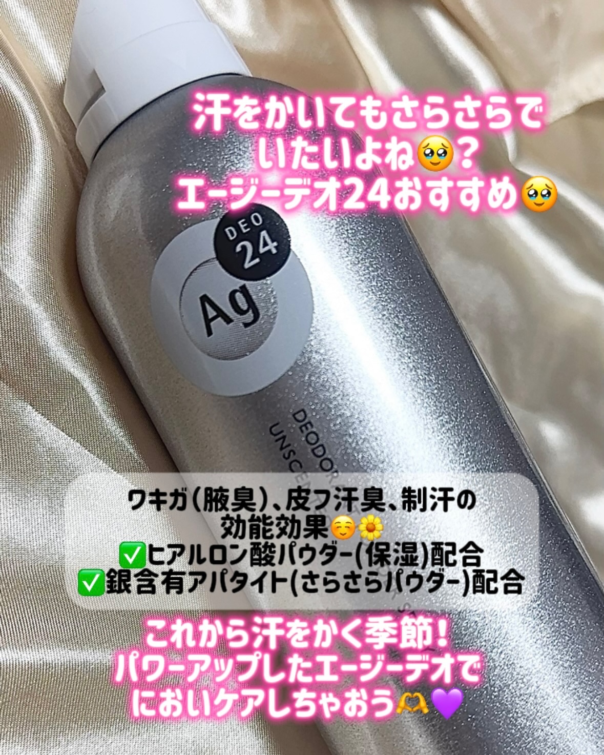 AGが6年ぶりにフルリニューアル!! なんとエージーデオ24史上最高の持力を実現🤍 殺菌成分”イソプロビルメチルフェノールSP複合体”へと進化! さらさらパウダー配合の複合体にすることで、肌表面にたまりやすく留まりやすく、汗や皮脂を吸着しながら、ニオイ菌を殺菌し防臭✨ ヒアルロン酸パウダー(保湿)配合だから、お肌にやさしく使えるし、銀含有アパタイト(さらさらパウダー)配合だから、サラサラ〜ッとベタつき感なく快適な使用感🤍