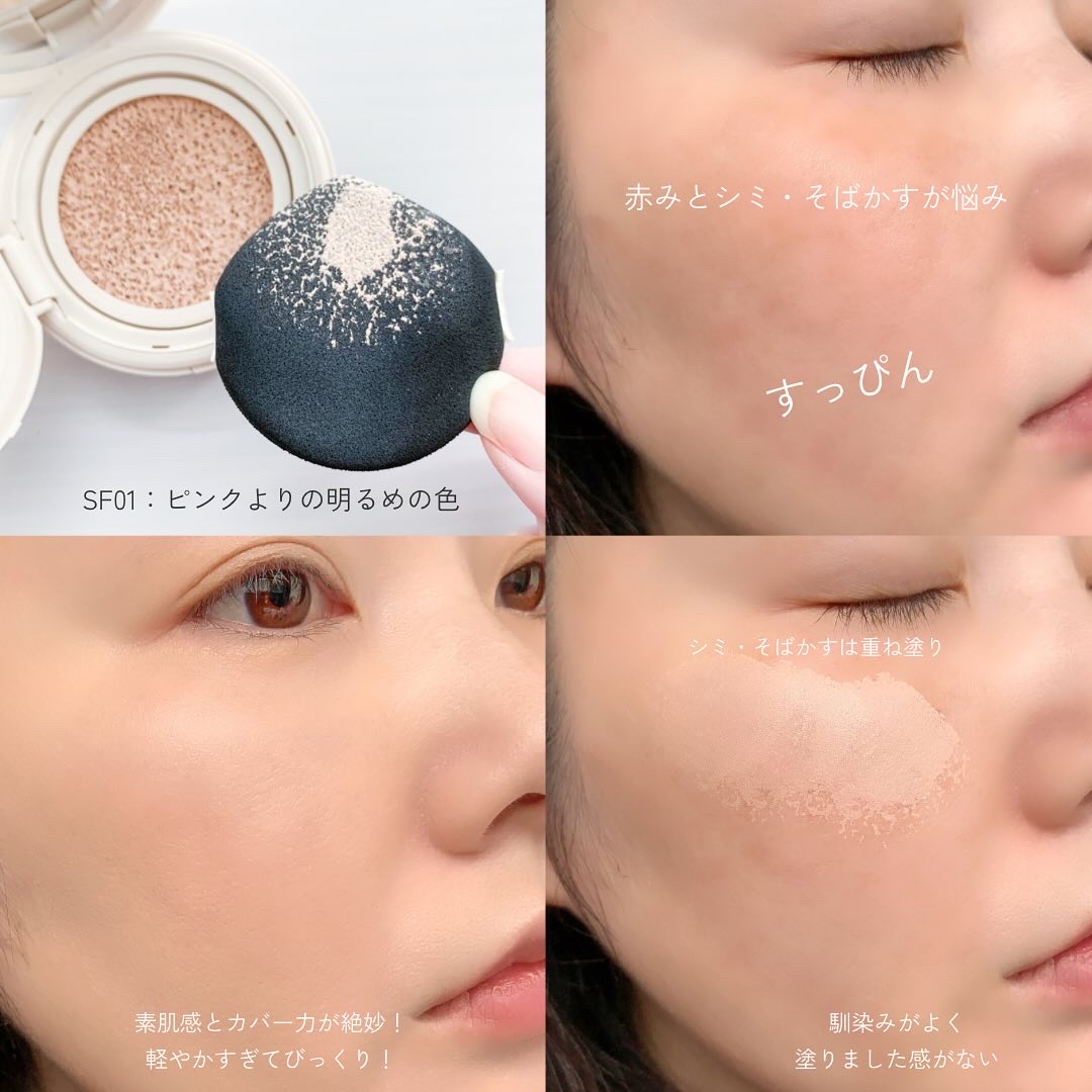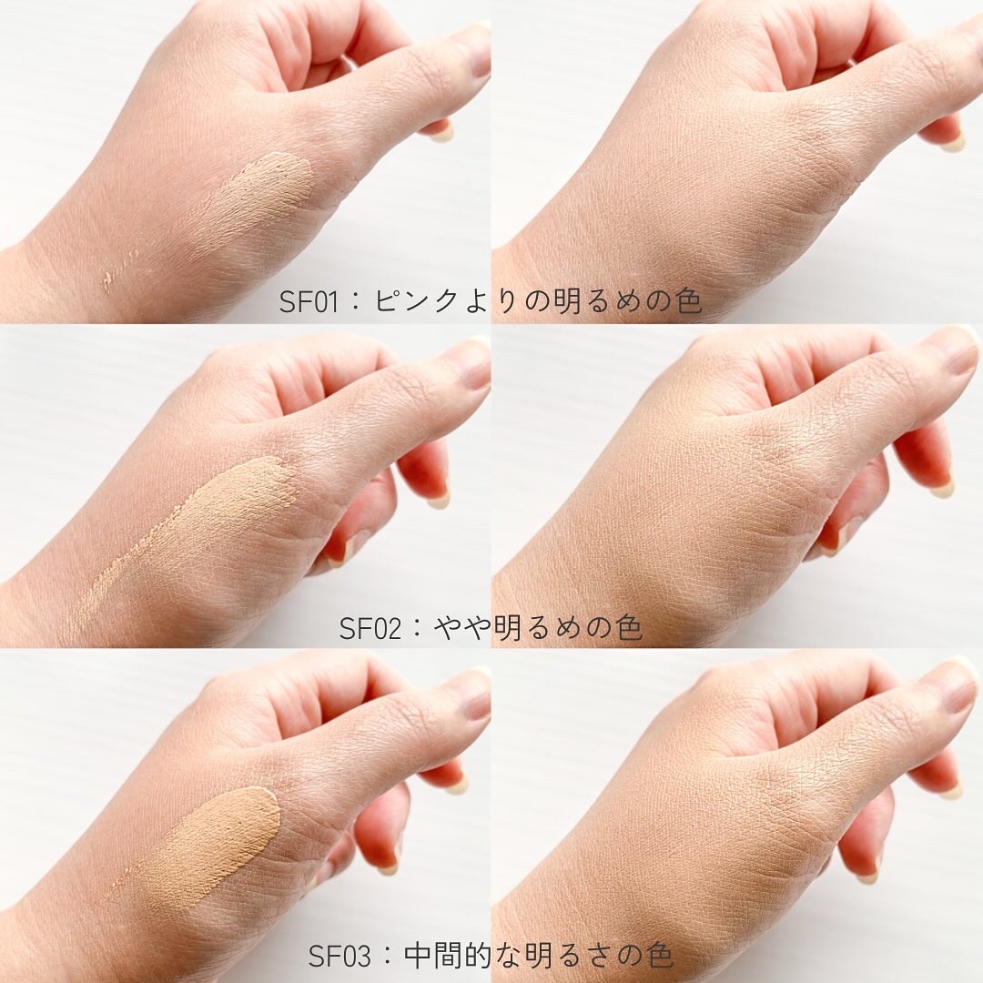 - <SF01 ライトベージュ(本体)> ジメチコン、水、酸化チタン、酸化亜鉛、BG、グリセリン、ジフェニルシロキシフェニルトリメチコン、ジカプリン酸ネオペンチルグリコール、メトキシケイヒ酸エチルヘキシル、PEG-10ジメチコン、キシリトール、イソステアリン酸、PEG-32、パルミチン酸アスコルビルリン酸3Na、ナイアシンアミド、グリシルグリシン、セラミドNG、セラミドNP、セラミドAP、セルロース、EDTA-2Na、キサンタンガム、クオタニウム-18ヘクトライト、ステアリン酸Mg、セスキイソステアリン酸ソルビタン、トリメチルシロキシケイ酸、ノイバラ果実エキス、ハイドロゲンジメチコン、フィトステロールズ、ラウロイルグルタミン酸Na、リシン、塩化Mg、水酸化Al、水添レシチン、硫酸Mg、フェノキシエタノール、マイカ、合成フルオロフロゴパイト、酸化鉄 <SF02 ミディアムベージュ(本体)> ジメチコン、水、酸化チタン、酸化亜鉛、BG、グリセリン、ジフェニルシロキシフェニルトリメチコン、ジカプリン酸ネオペンチルグリコール、メトキシケイヒ酸エチルヘキシル、PEG-10ジメチコン、キシリトール、イソステアリン酸、PEG-32、パルミチン酸アスコルビルリン酸3Na、ナイアシンアミド、グリシルグリシン、セラミドNG、セラミドNP、セラミドAP、セルロース、EDTA-2Na、キサンタンガム、クオタニウム-18ヘクトライト、ステアリン酸Mg、セスキイソステアリン酸ソルビタン、トリメチルシロキシケイ酸、ノイバラ果実エキス、ハイドロゲンジメチコン、フィトステロールズ、ラウロイルグルタミン酸Na、リシン、塩化Mg、水酸化Al、水添レシチン、硫酸Mg、フェノキシエタノール、マイカ、合成フルオロフロゴパイト、酸化鉄 <SF03 ナチュラルベージュ(本体)> ジメチコン、水、酸化チタン、酸化亜鉛、BG、グリセリン、ジフェニルシロキシフェニルトリメチコン、ジカプリン酸ネオペンチルグリコール、メトキシケイヒ酸エチルヘキシル、PEG-10ジメチコン、キシリトール、イソステアリン酸、PEG-32、パルミチン酸アスコルビルリン酸3Na、ナイアシンアミド、グリシルグリシン、セラミドNG、セラミドNP、セラミドAP、セルロース、EDTA-2Na、キサンタンガム、クオタニウム-18ヘクトライト、ステアリン酸Mg、セスキイソステアリン酸ソルビタン、トリメチルシロキシケイ酸、ノイバラ果実エキス、ハイドロゲンジメチコン、フィトステロールズ、ラウロイルグルタミン酸Na、リシン、塩化Mg、水酸化Al、水添レシチン、硫酸Mg、フェノキシエタノール、マイカ、合成フルオロフロゴパイト、酸化鉄 <SF01 ライトベージュ(リフィル)> ジメチコン、水、酸化チタン、酸化亜鉛、BG、グリセリン、ジフェニルシロキシフェニルトリメチコン、ジカプリン酸ネオペンチルグリコール、メトキシケイヒ酸エチルヘキシル、PEG-10ジメチコン、キシリトール、イソステアリン酸、PEG-32、パルミチン酸アスコルビルリン酸3Na、ナイアシンアミド、グリシルグリシン、セラミドNG、セラミドNP、セラミドAP、セルロース、EDTA-2Na、キサンタンガム、クオタニウム-18ヘクトライト、ステアリン酸Mg、セスキイソステアリン酸ソルビタン、トリメチルシロキシケイ酸、ノイバラ果実エキス、ハイドロゲンジメチコン、フィトステロールズ、ラウロイルグルタミン酸Na、リシン、塩化Mg、水酸化Al、水添レシチン、硫酸Mg、フェノキシエタノール、マイカ、合成フルオロフロゴパイト、酸化鉄 <SF02 ミディアムベージュ(リフィル)> ジメチコン、水、酸化チタン、酸化亜鉛、BG、グリセリン、ジフェニルシロキシフェニルトリメチコン、ジカプリン酸ネオペンチルグリコール、メトキシケイヒ酸エチルヘキシル、PEG-10ジメチコン、キシリトール、イソステアリン酸、PEG-32、パルミチン酸アスコルビルリン酸3Na、ナイアシンアミド、グリシルグリシン、セラミドNG、セラミドNP、セラミドAP、セルロース、EDTA-2Na、キサンタンガム、クオタニウム-18ヘクトライト、ステアリン酸Mg、セスキイソステアリン酸ソルビタン、トリメチルシロキシケイ酸、ノイバラ果実エキス、ハイドロゲンジメチコン、フィトステロールズ、ラウロイルグルタミン酸Na、リシン、塩化Mg、水酸化Al、水添レシチン、硫酸Mg、フェノキシエタノール、マイカ、合成フルオロフロゴパイト、酸化鉄 <SF03 ナチュラルベージュ(リフィル )> ジメチコン、水、酸化チタン、酸化亜鉛、BG、グリセリン、ジフェニルシロキシフェニルトリメチコン、ジカプリン酸ネオペンチルグリコール、メトキシケイヒ酸エチルヘキシル、PEG-10ジメチコン、キシリトール、イソステアリン酸、PEG-32、パルミチン酸アスコルビルリン酸3Na、ナイアシンアミド、グリシルグリシン、セラミドNG、セラミドNP、セラミドAP、セルロース、EDTA-2Na、キサンタンガム、クオタニウム-18ヘクトライト、ステアリン酸Mg、セスキイソステアリン酸ソルビタン、トリメチルシロキシケイ酸、ノイバラ果実エキス、ハイドロゲンジメチコン、フィトステロールズ、ラウロイルグルタミン
