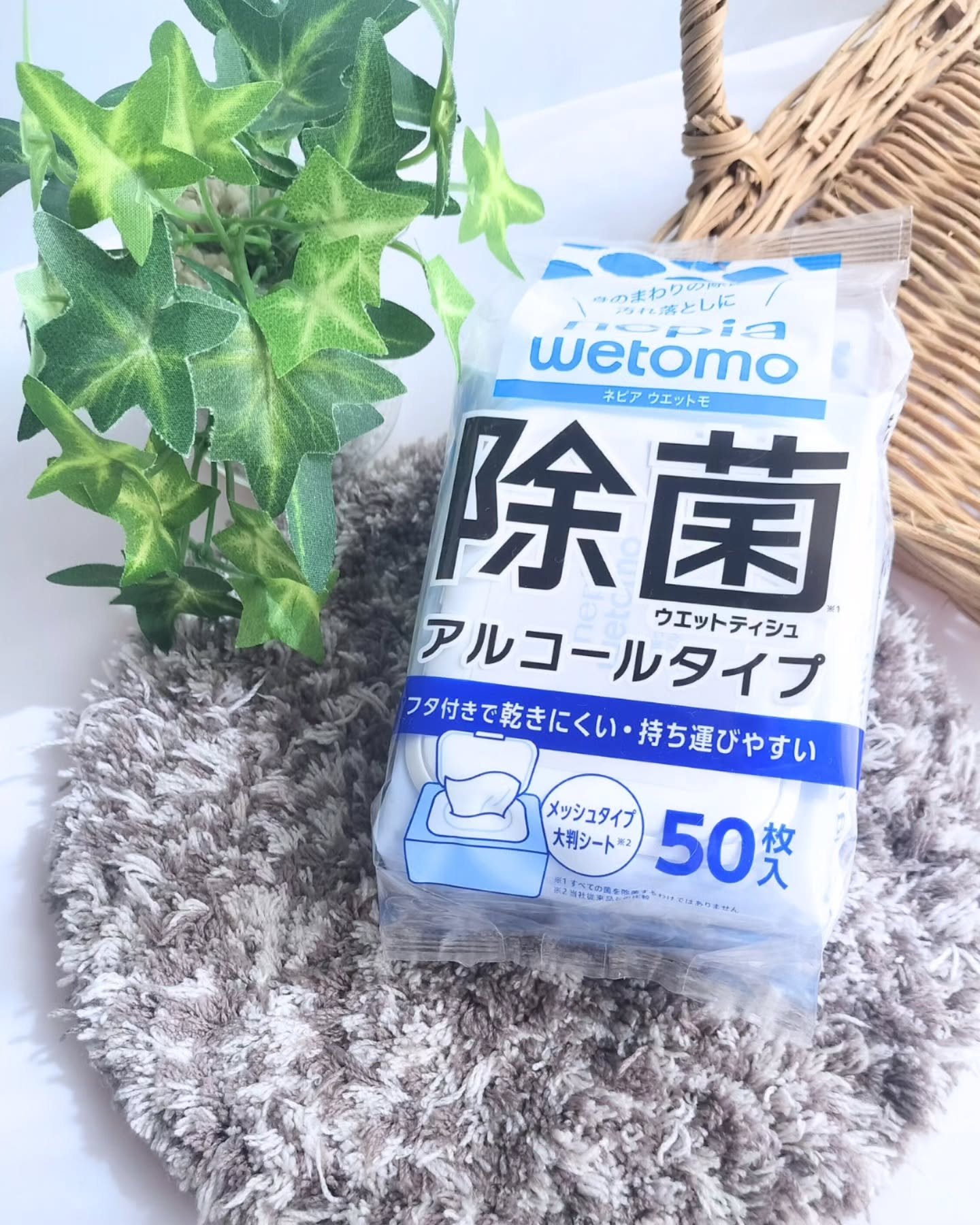 ネピアwetomo 除菌ウエットティシュアルコールタイプ 50枚入り 手が汚れる💦って時に役に立つのがこれ。ウエットティシュって、大きすぎか小さすぎなイメージあるけどこれはちょうどいいサイズ! 蓋がちゃんとついてるから、すぐに蒸発してカラカラ、なんてことにならなそう。
