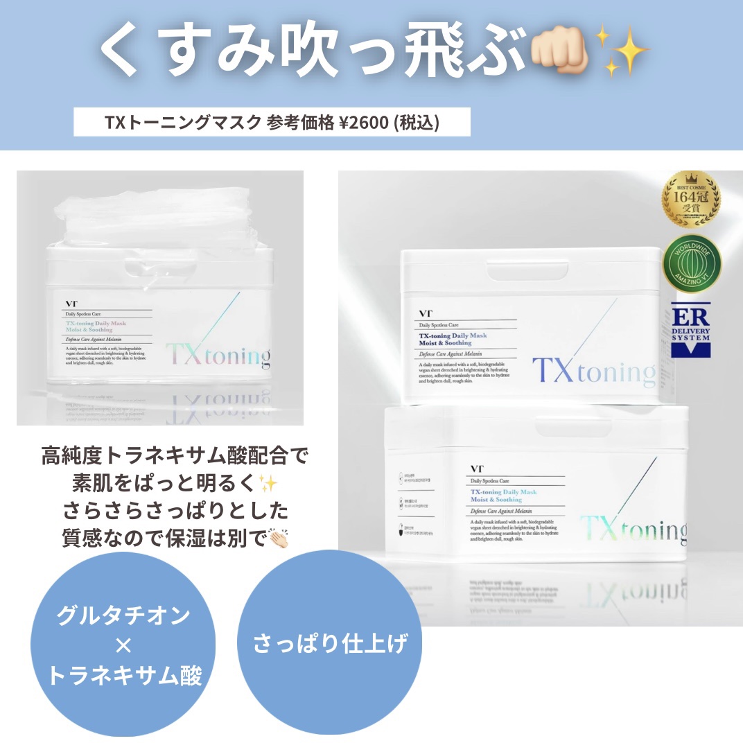 シートマスクの絶対王者 VT 累計1620万個販売シートマスクから話題成分アゼライン酸・PDRN新作登場 軽く薄いつけ心地が肌にぴたっと密着ししてくれエッセンスをしっかりと肌角層に届けてくれます 植物性PDRNは他社と違ってVTのPDRNは植物性で、肌の内側からコラーゲンを生み出し弾力ケアはもちろんニキビ跡ケアまででき肌を健やかな状態へ