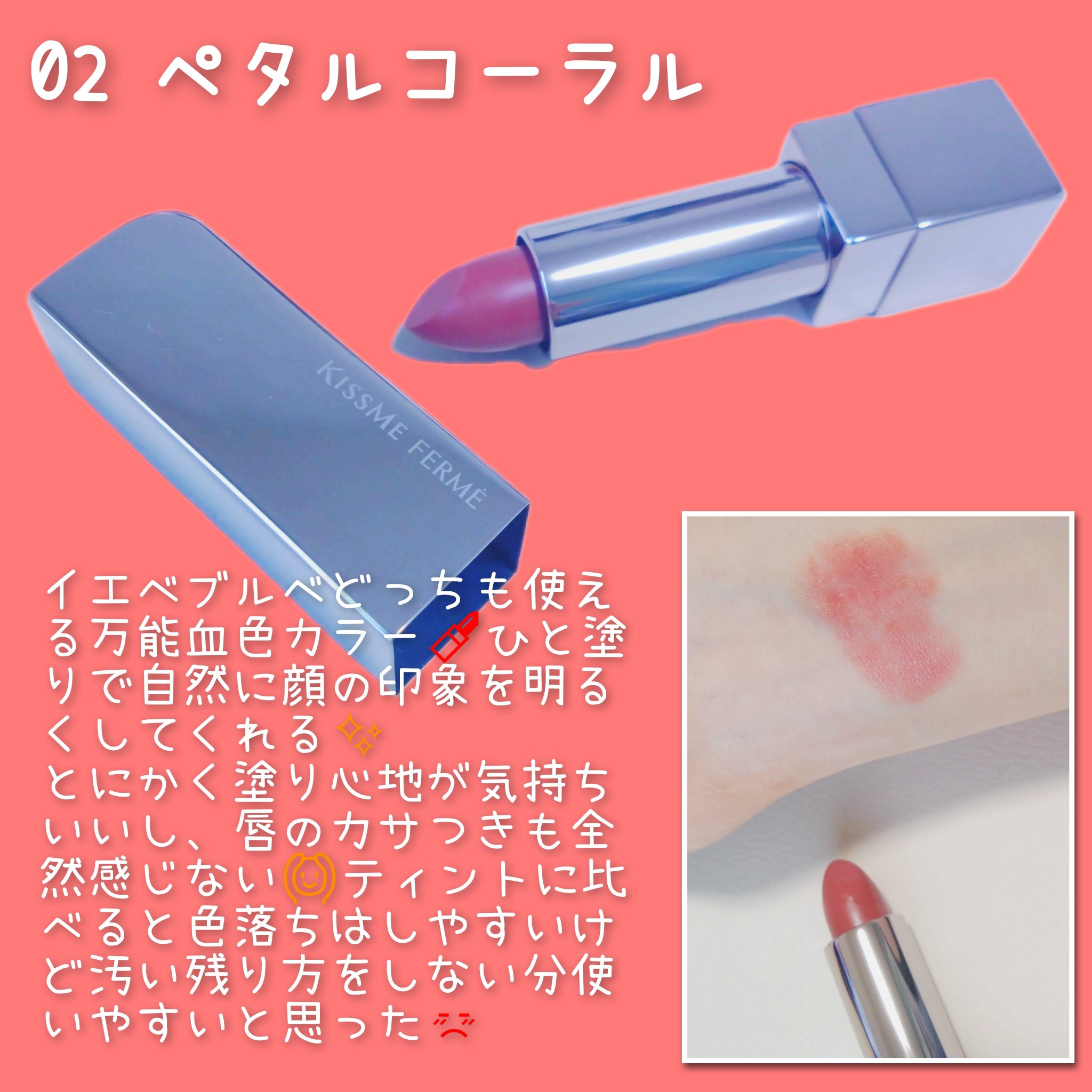 キスミーフェルムさまからいただきました3月17日に発売される"ルージュアクトトリコタッチ"💄✂今回モニターしたのは02ペタルコーラル。するっとなめらかな着け心地で、肌が明るめな方には万能なかわいいコーラルピンク🩷️唇よわよわのわたしでも荒れた...