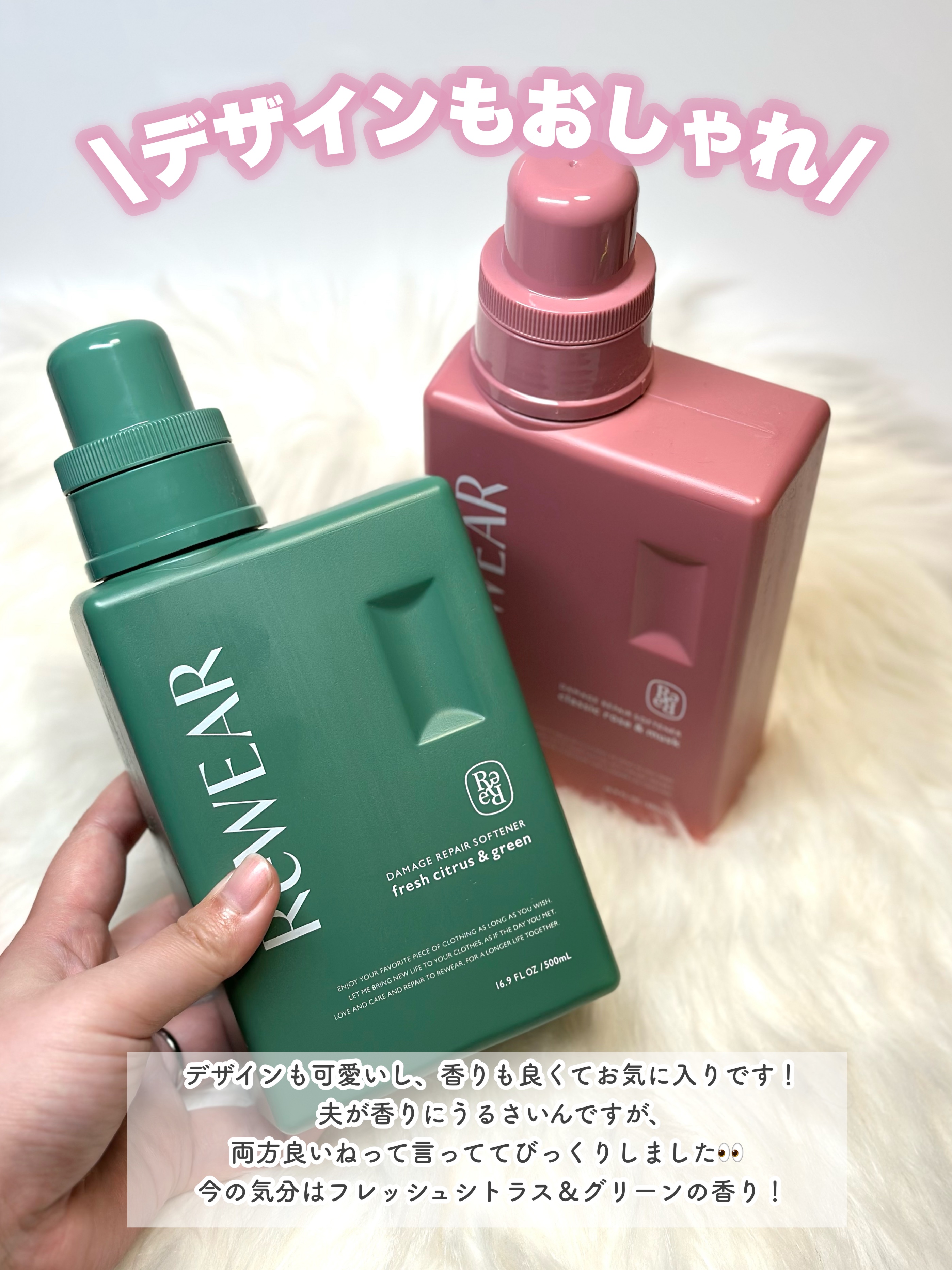 とにかくいい香りの柔軟剤に出会ったからシェアするね💓 ReWEARの再生柔軟剤なんだけど、香りはこちらの2種類! ブラックカラントとオレンジのフレッシュな香りに、ローズとピオニーのフルーティーフローラルの香りが合わさって、上品で華やかに香ってくれるよ セルラーゼという酵素の力で、毛玉や毛羽立ち、色くすみを復活してくれるんだって👀